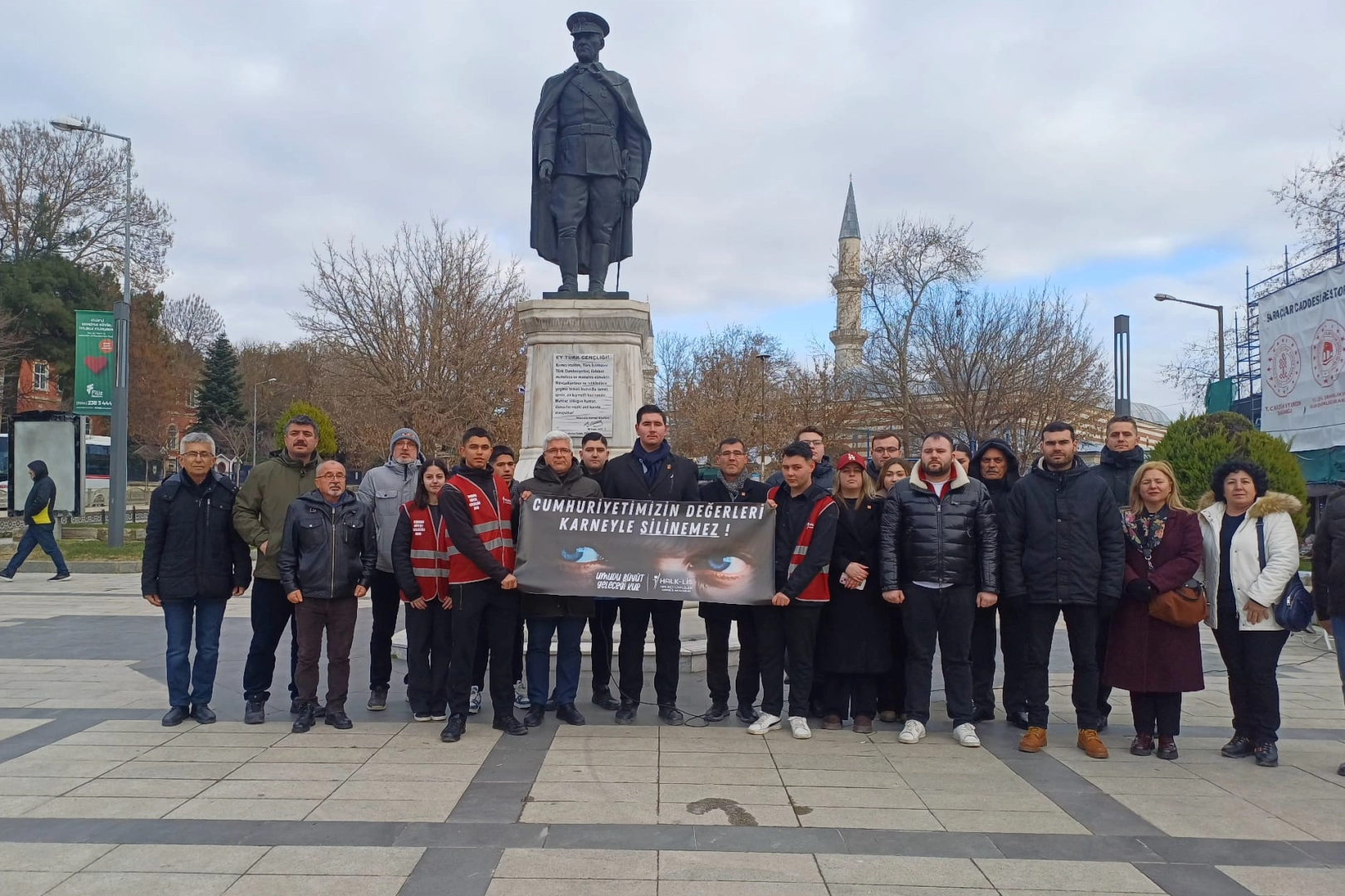 Okul karnelerinden Atatürk’ün fotoğrafı ve İstiklal marşının çıkarılmasına yönelik uygulamaya tepki gösteren Halkçı Liseliler, Edirne’deki Atatürk anıtı önünde basın açıklaması yaptı.