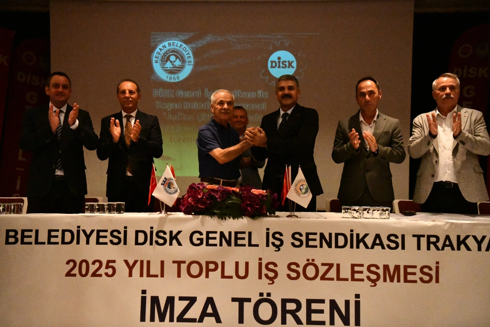 Keşan Belediyesi Selim Sesler Tiyatro ve Konferans Salonu’nda gerçekleşen imza törenine, Keşan Belediye Başkanı Op. Dr. Mehmet Özcan, DİSK Genel İş Sendikası Başkanı Remzi Çalışkan, Belediye Başkan Yardımcıları, meclis üyeleri, DİSK temsilcileri, birim amirleri ve belediye çalışanları katıldı.