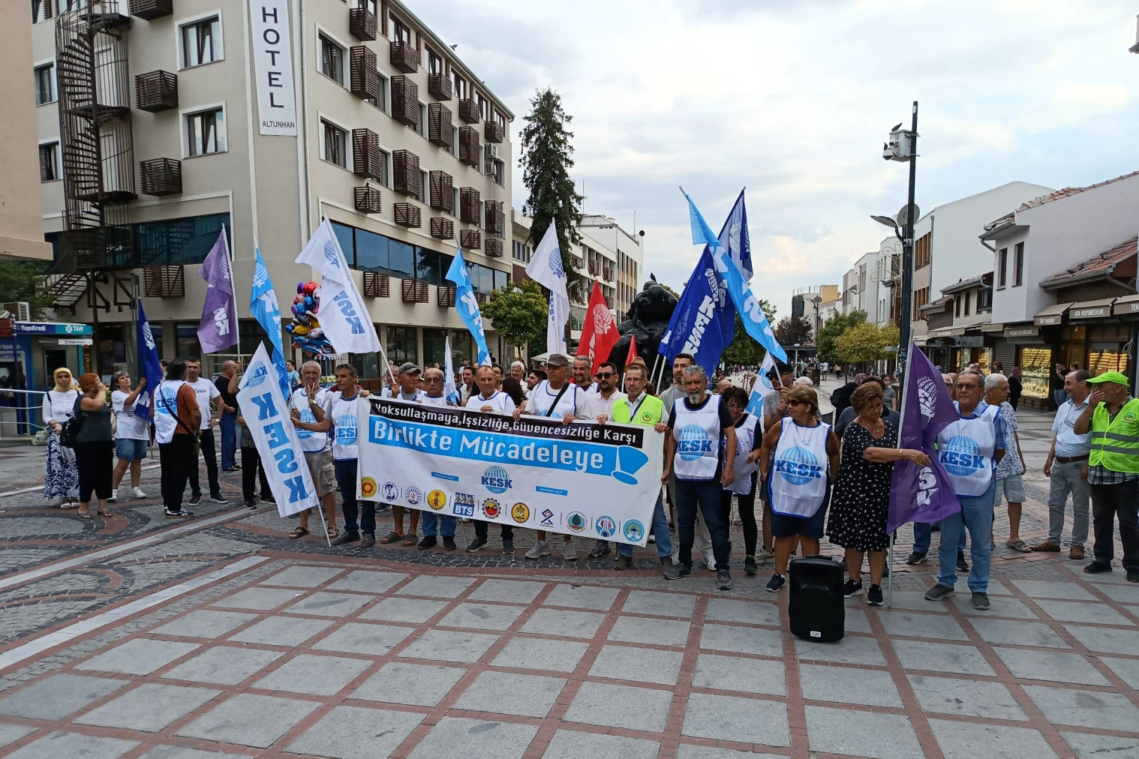 Edirne’de KESK’e bağlı sendikalar, 8’inci dönem toplu iş görüşmelerinde tarafların uzlaşamaması sonucu bugün 1 günlük iş bırakma eylemi yaparak Saraçlar Caddesi’nde basın açıklaması düzenlediler.