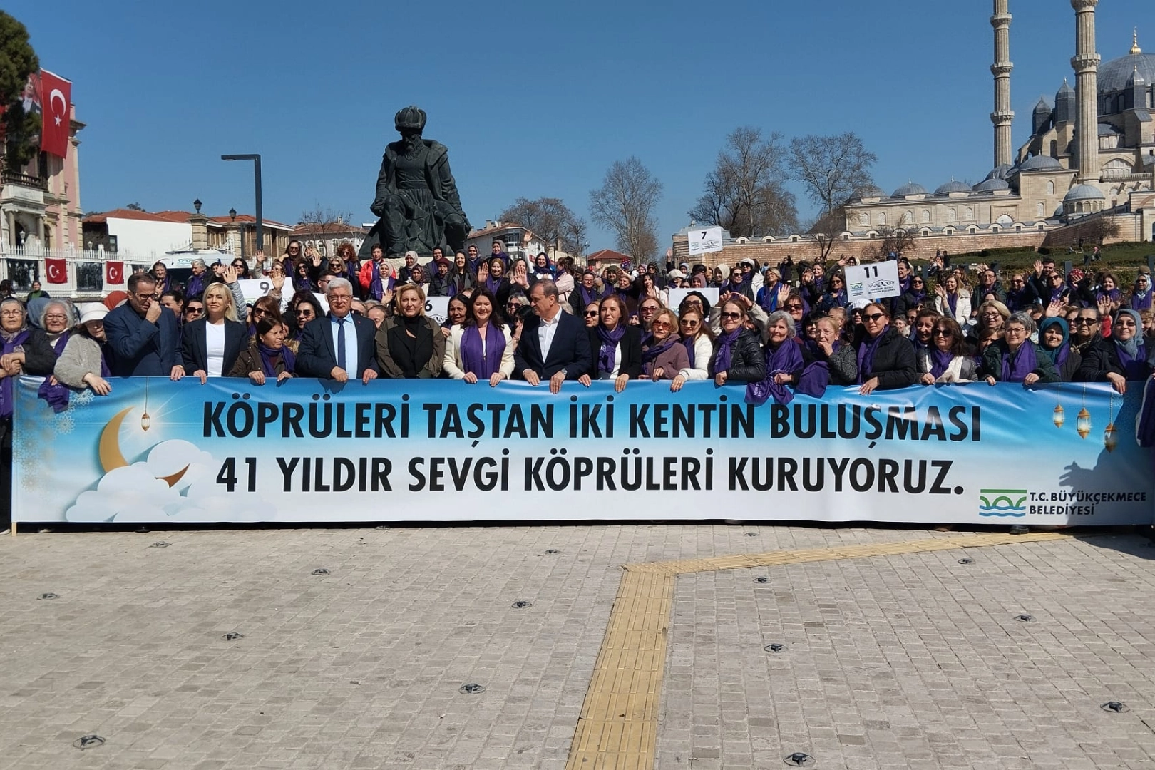 Büyükçekmeceli yaklaşık 2 bin kadın “Köprüleri Taştan İki Kentin Buluşması” etkinliğinde Edirne’yi 41’inci kez ziyaret etti. Büyükçekmece Belediyesi’nin organizasyonunda gerçekleşen etkinlikte Edirne’ye gelen Büyükçekmeceliler, tarihi ve kültürel zenginlikleriyle Türkiye’nin önemli şehirlerinden birisi olan Edirne’yi gezdiler. Selimiye Camii önünde Edirne Belediye Başkanı Filiz Gencan tarafından karşılanan Büyükçekmeceliler, burada Edirne Belediye Başkanı Filiz Gencan ve Büyükçekmece Belediye Başkanvekili Hakan Çebi ile hatıra fotoğrafı çektirdiler.