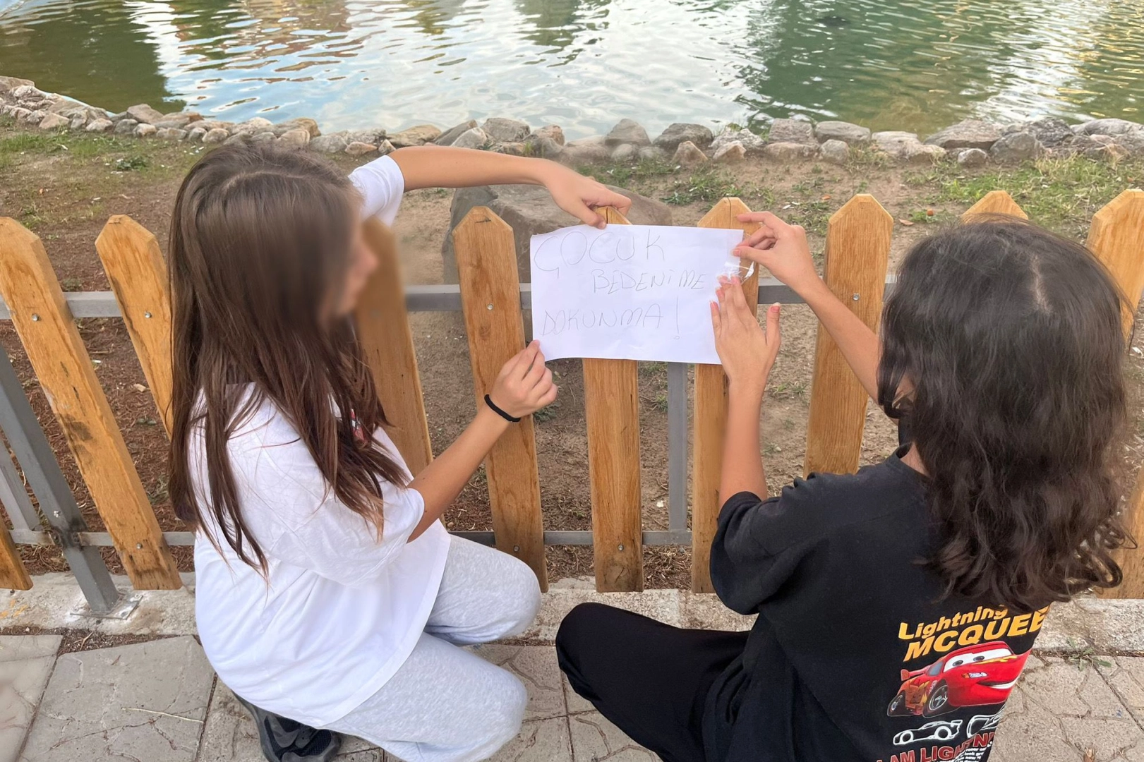 Edirne’de Şükrüpaşa mahallesinde bulunan Cemre Duru Sağlam ve Gözde Subaşı isimli iki kız çocuğu, son zamanlarda artan kadın cinayetleri hakkında büyüklere uyarıcı yazılar hazırladılar. Çocuklar hazırladıkları bu yazıları Şükrüpaşa Mahallesi’ndeki suni göleti çevreleyen çitlere astılar.