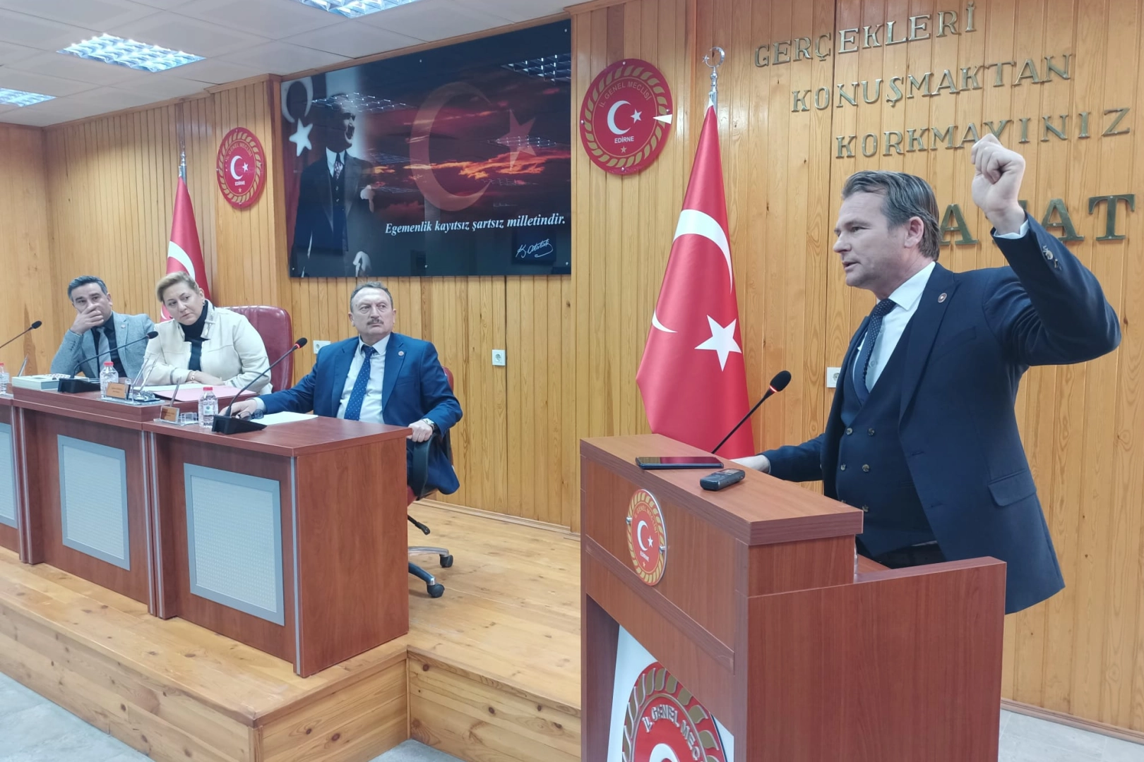 “ÜSLUBUNU DOĞRU BULMUYORUZ”Üstün’ün konuşmasının ardından AK Parti grubundan meclis üyeleri Sarıçam’ın üslubunu doğru bulmadıklarını dile getirdiler. İl Genel Meclisi Başkanı Çiğdem Gegeoğlu da Sarıçam’ın Edirne halkından özür dilemesi gerektiğini belirtti.