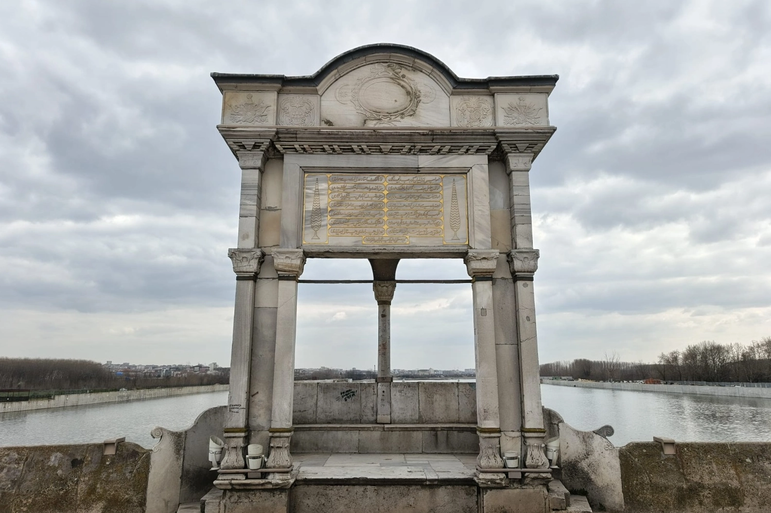 Mimarı belli olmayan köprünün en dikkat çeken bölümlerinden biri ise mermerden yapılan kitabe köşkü. Mermer cephe süslemeleri, ay yıldızlı motifleri, Osmanlı armalarıyla dikkat çeken köşk, süslemeleriyle döneminin nadir örneklerden biri.