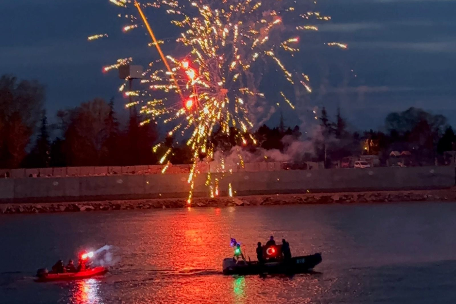 Deniz Polisi ekiplerinin zodyak botlarla, ellerinde şanlı Türk bayraklarıyla nehir üzerinde gerçekleştirdiği geçiş, izleyenleri gururlandırdı. Akşam saatlerinde düzenlenen ve havai fişek gösterileriyle renklenen bu özel anlar, protokol üyeleri ve vatandaşlar tarafından büyük bir ilgi ve alkışlarla takip edildi.