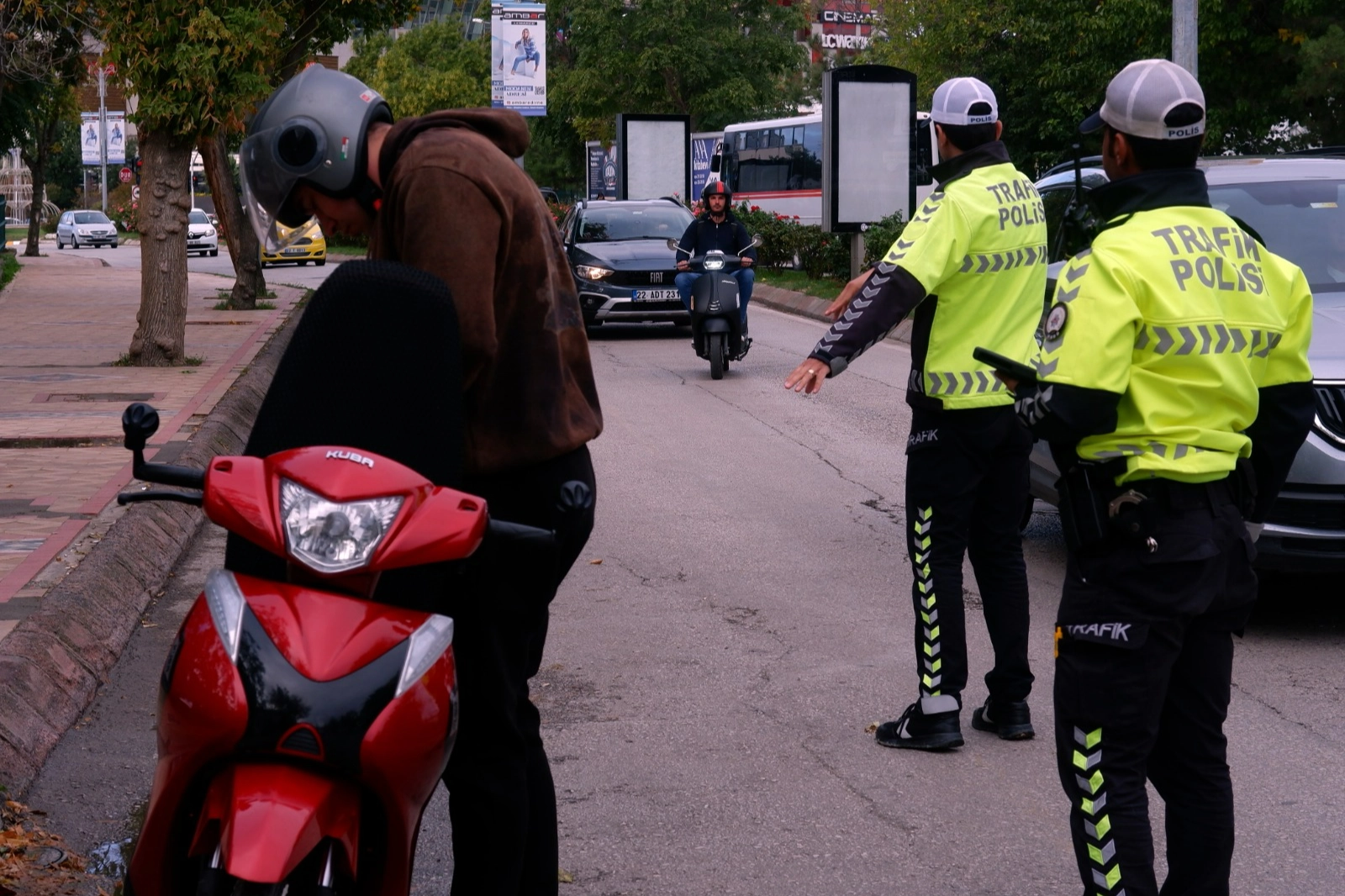 Motosiklet sürücülerinin evraklarını kontrol eden ekipler, kask takmayan sürücülere cezai işlem uyguladı. Denetimde durdurulan sürücülere kask ve koruyucu ekipmanların önemini de anlatan ekipler, kaskın yaralanma riskini azalttığını vurguladı.
