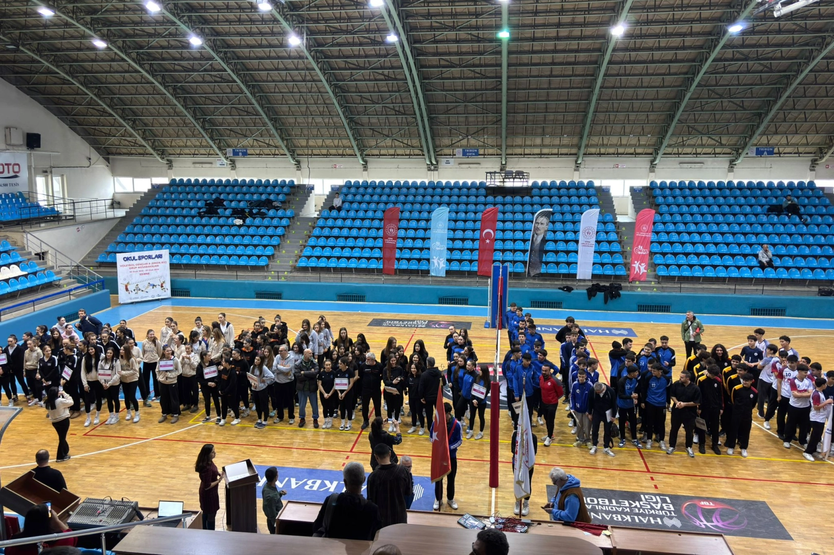 Edirne’de Okul Sporları Voleybol Gençler (Erkek-Kız) Grup Karşılaşmaları açılış seremonisi Mimar Sinan Spor Salonu’nda gerçekleştirildi. Saygı duruşu ve İstiklal Marşı ile başlayan program açılış konuşmasıyla devam etti.