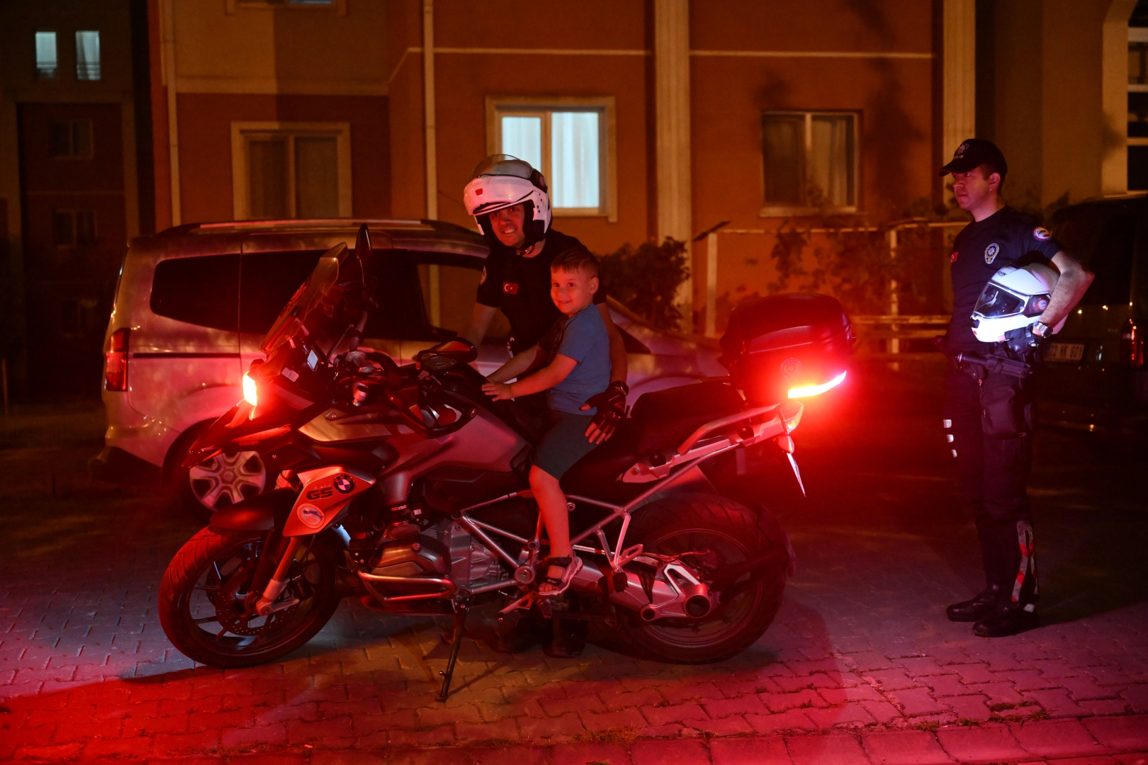 Akrabalarını ziyaret için ailesiyle İzmir'den kente gelen 7 yaşındaki Ömer Yamaç Üstünol, asayiş ve trafik denetimine katılan Edirne Emniyet Müdürü Onur Karaburun ile sohbet etti.