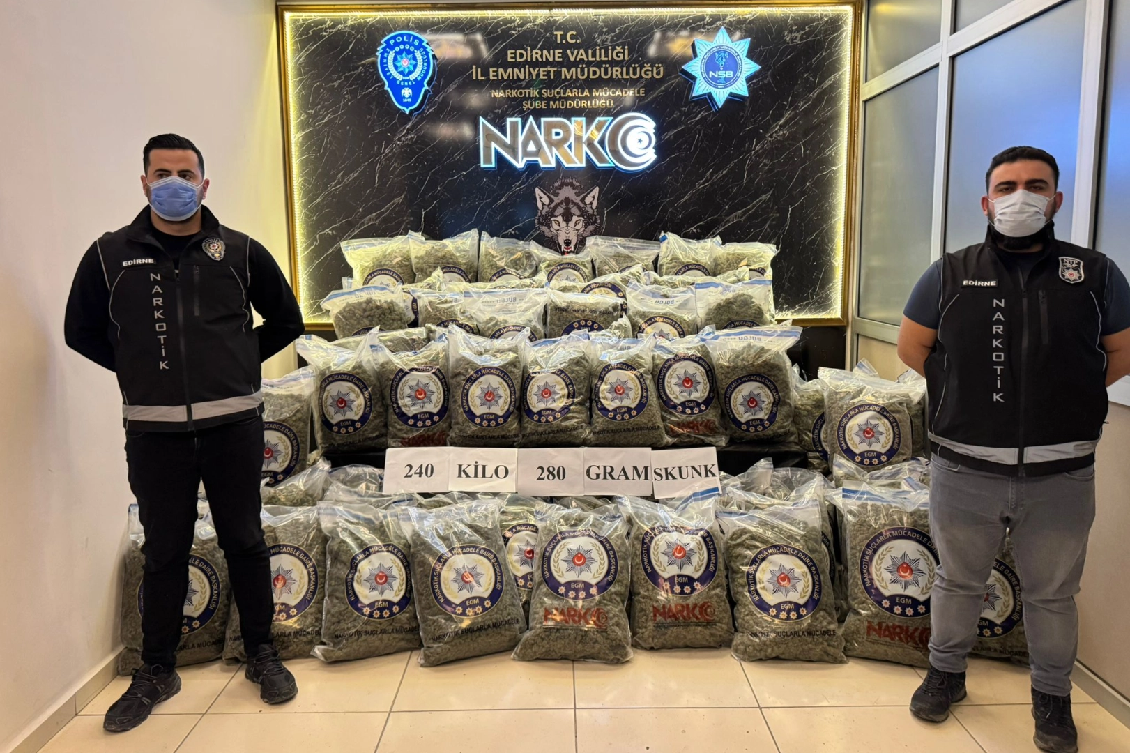 Edirne Emniyet Müdürlüğü Narkotik Suçlarla Mücadele Şube Müdürlüğü ekipleri, uluslararası uyuşturucu sevkiyatı yapılacağı bilgisi üzerine Kapıkule Gümrük Muhafaza Kaçakçılık ve İstihbarat Şube Müdürlüğü ile koordineli bir operasyon düzenledi. Bir tırda yapılan aramada ele geçirilen 240 kilogram skunk, operasyonun boyutunu gözler önüne sermek amacıyla emniyette sergilendi.