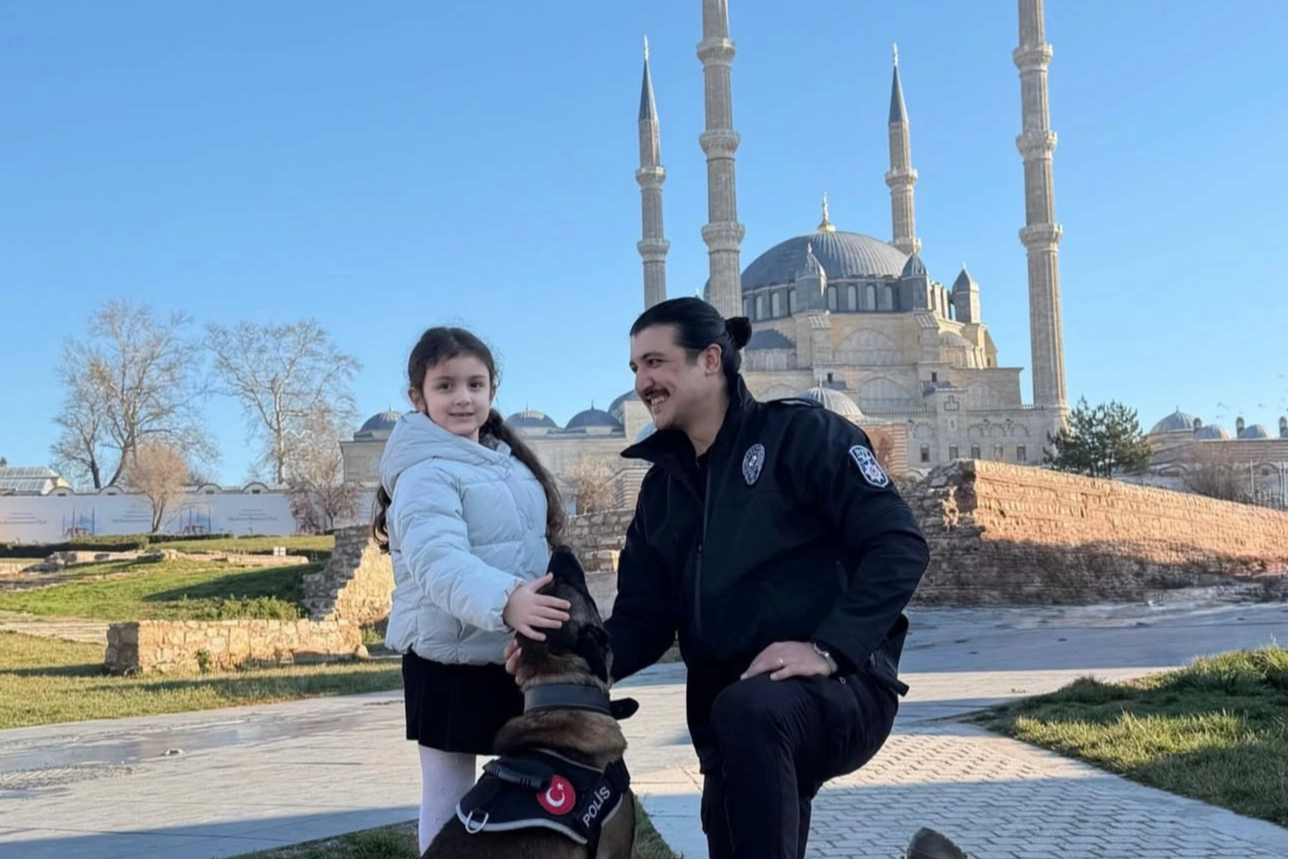 Fotoğrafta polis memuru, bir çocuk ve görev köpeğiyle birlikte Selimiye Camii önünde poz verdi. Paylaşım kısa sürede çok sayıda beğeni aldı.