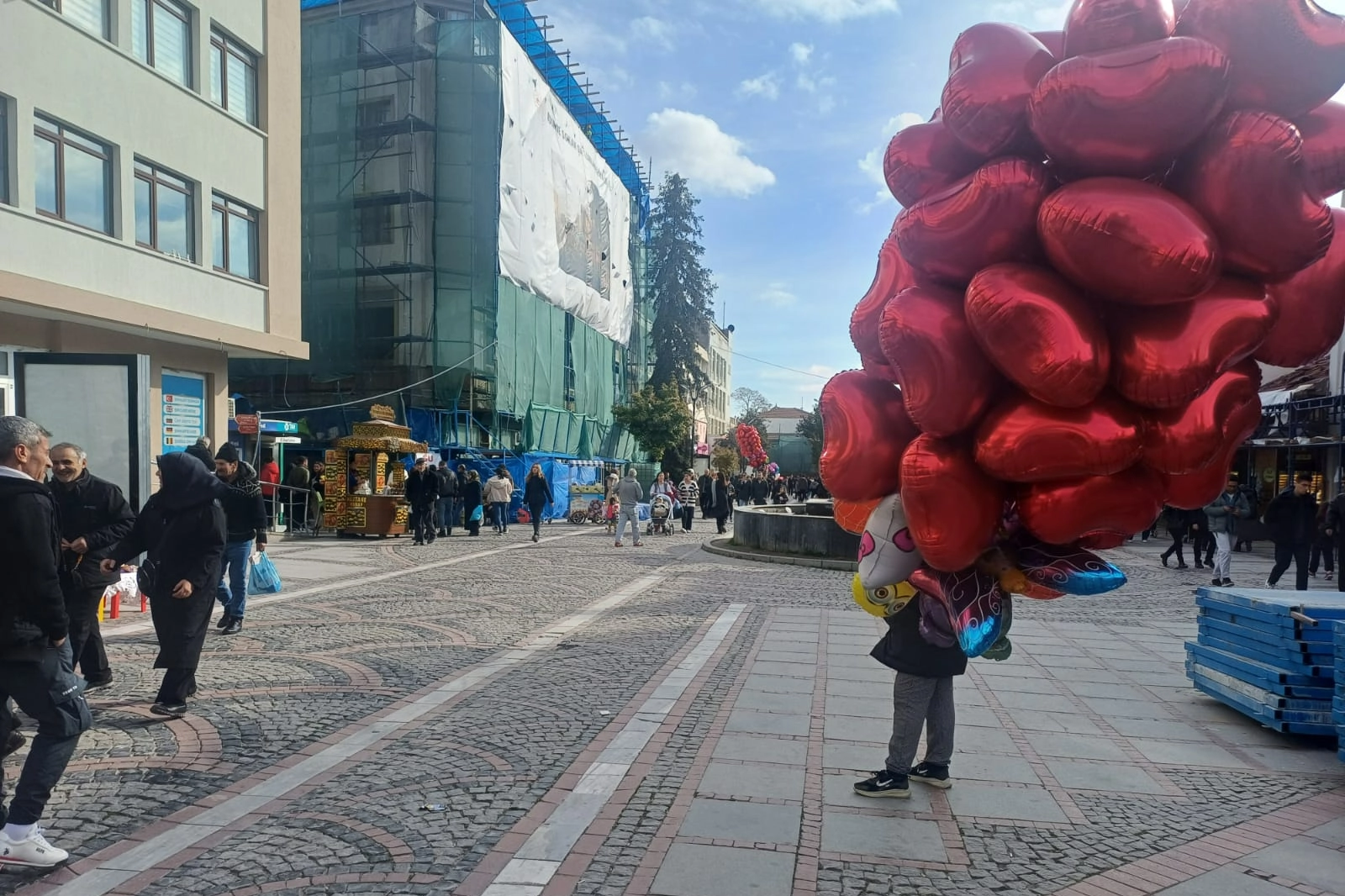 Edirne'nin yoğunluğuyla bilinen trafiğe kapalı Saraçlar Caddesi, 14 Şubat Sevgililer Günü coşkusu yaşıyor.