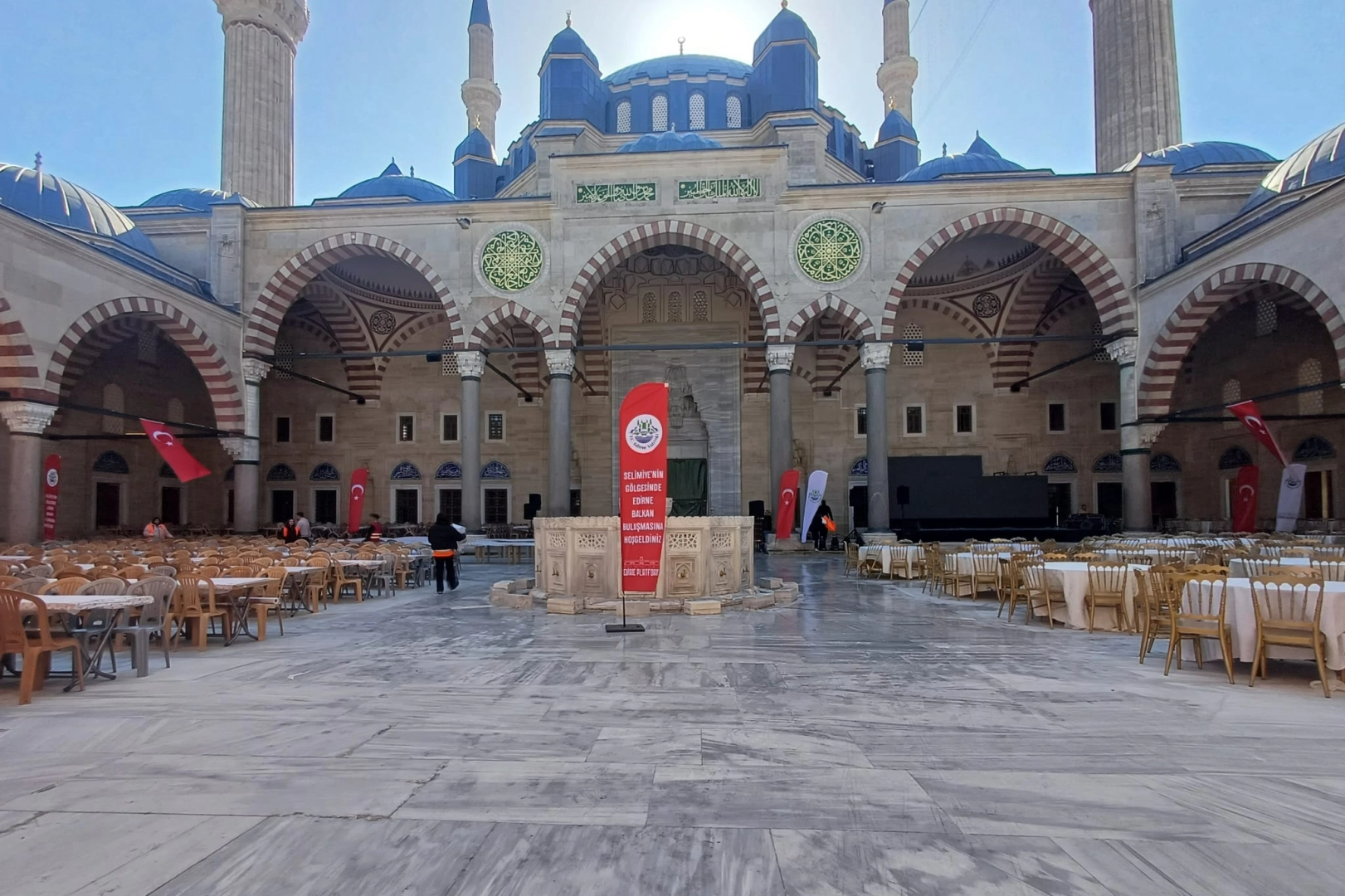 İftar programının yapılacağı Selimiye Camii avlusunda ekipler tarafından masa ve sandalyelerin kurulumu yapılırken, etkinlik kapsamında kullanılacak sahnenin kurulmasına da başlandı.