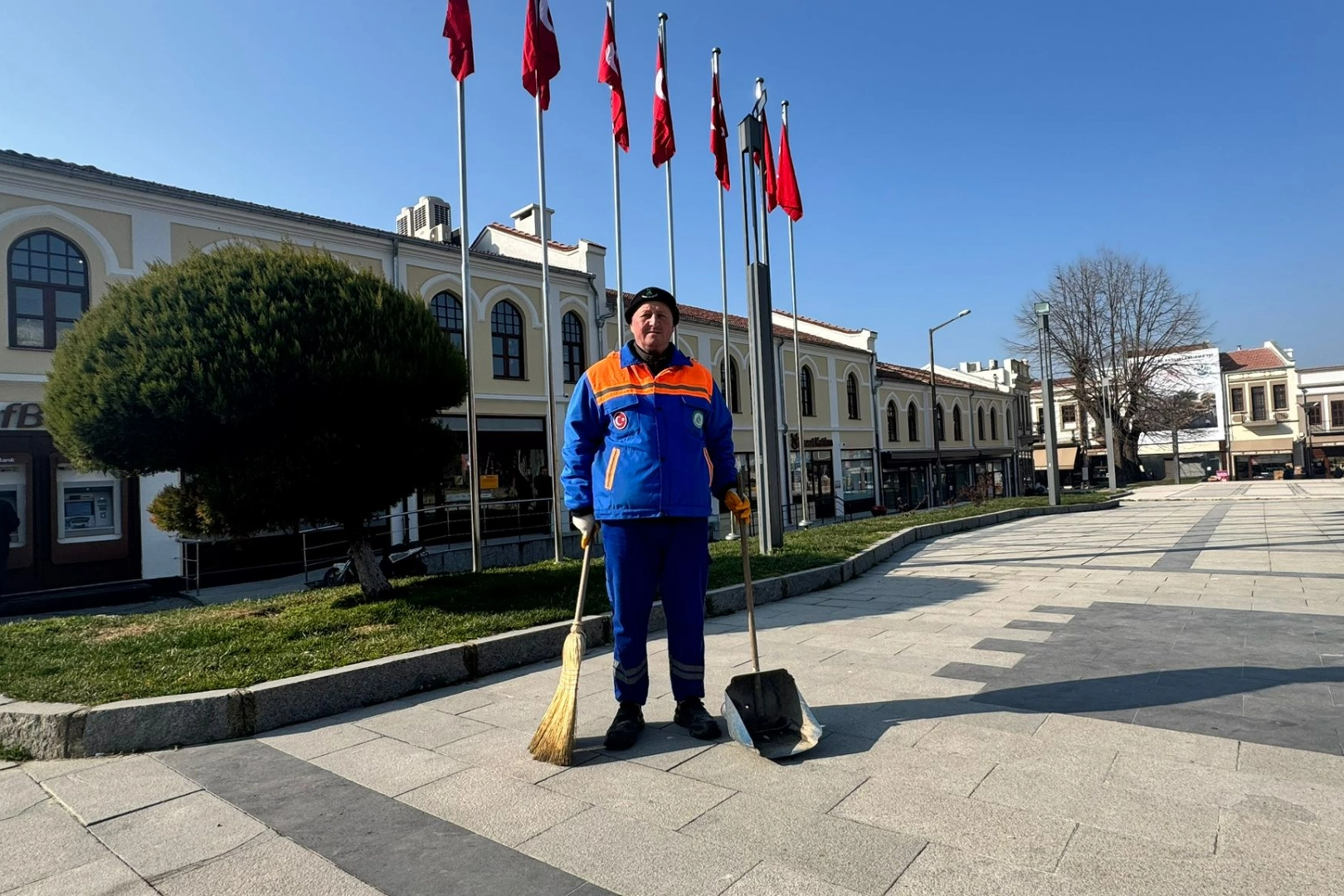 Geçtiğimiz günlerde Atatürk Anıtı önünde rüzgardan birbirine dolanan Türk bayraklarını tek tek düzelten ve ardından asker selamı duran Edirne Belediyesi temizlik personeli Recep İrden, sosyal medyada izlenme rekorları kırdı. Yüz binlerce kişinin paylaştığı o duygu dolu anların kahramanı, bugün yine aynı noktada görevini büyük bir sevdayla sürdürüyor.