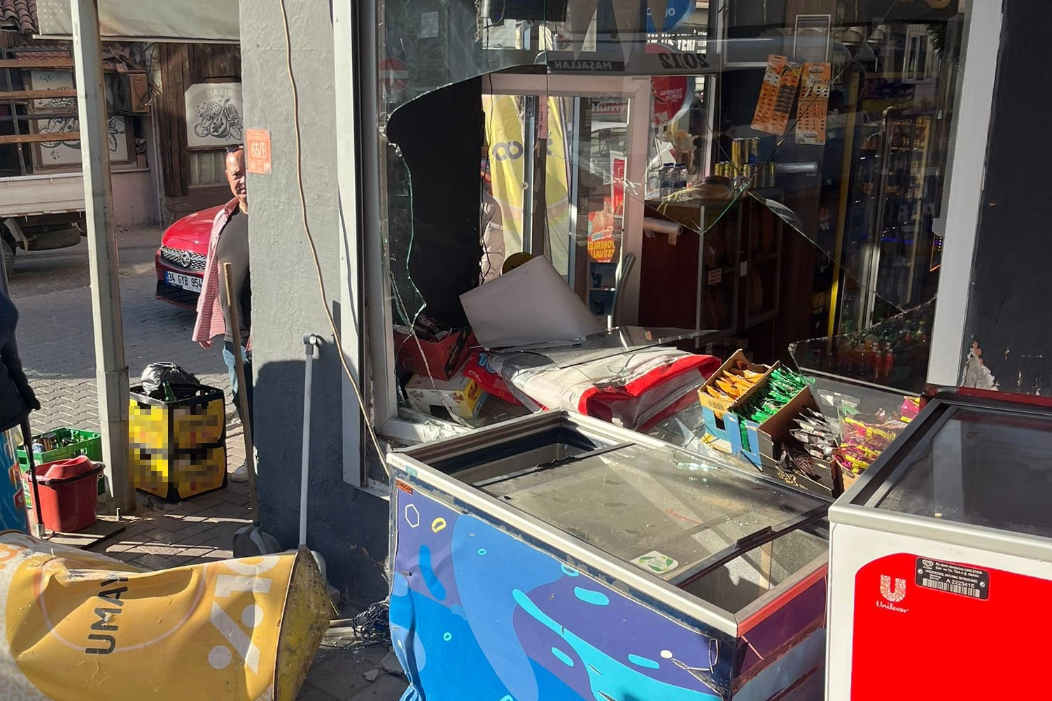 Alınan bilgiye göre, Uğur Mumcu Caddesi’nde ters yönde giden otomobil, Odun Pazarı Sokağa dönmek isterken sürücüsünün gaza basması sonucu kontrolden çıkarak önce yolun karşısına geçmek isteyen bir kadına, ardından köşedeki marketin duvarına çarptı. Kazada camı kırılan marketin içerisindeki ürünler yere devrilirken, yere düşen kadın çevredekilerin yardımıyla yerden kalkarak yoluna devam etti. Kaza anı ise güvenlik kameralarına yansıdı.