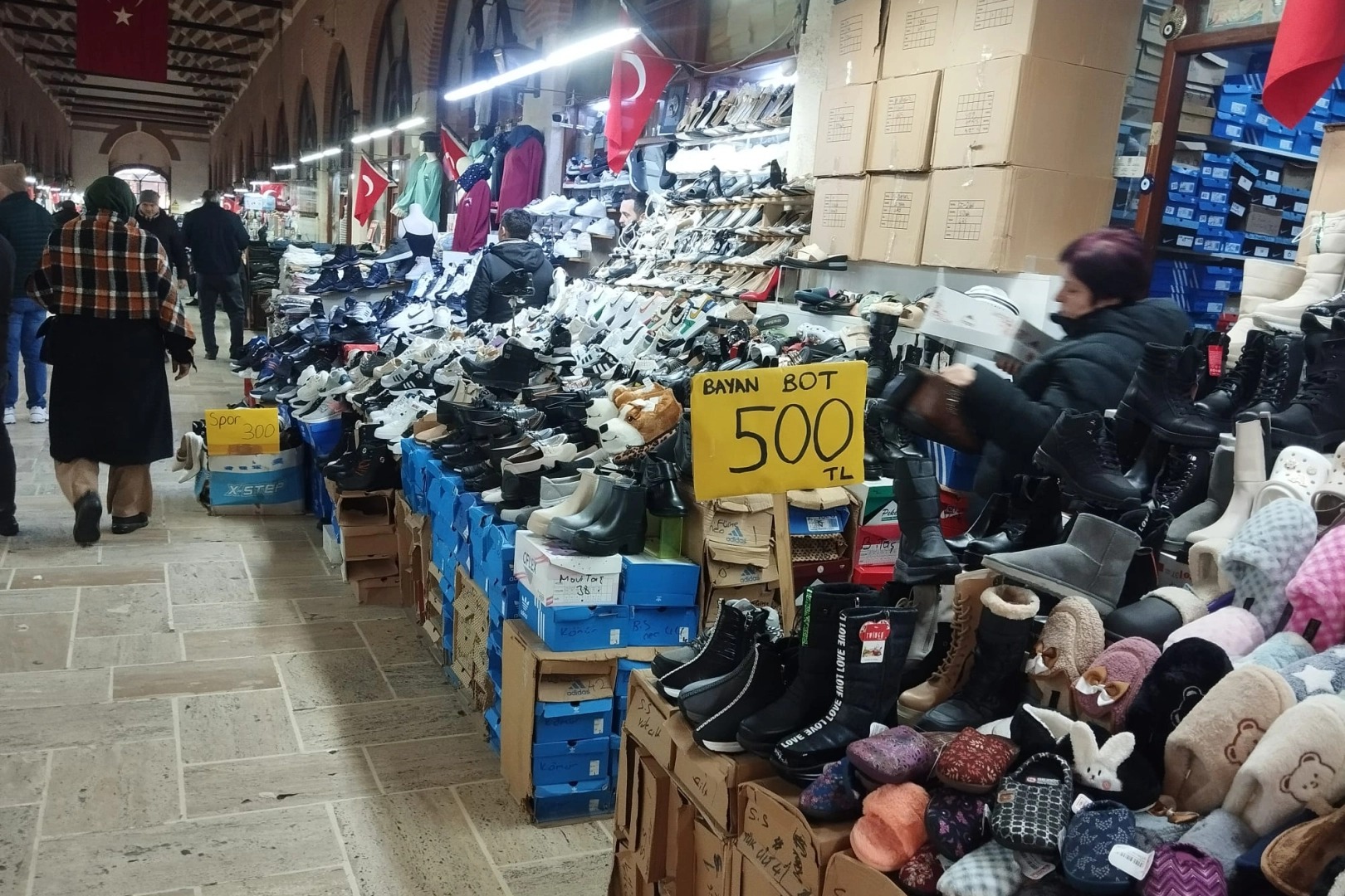Edirne’de 4 gündür aralıklarla devam eden kar yağışı sonrası tarihi Alipaşa Çarşısı’nda satılan botlara talep arttı. Talebin artması üzerine fiyatların yükselmesi beklenirken, esnaf daha da fiyat düşürerek 500 liradan bot satışına başladı.
