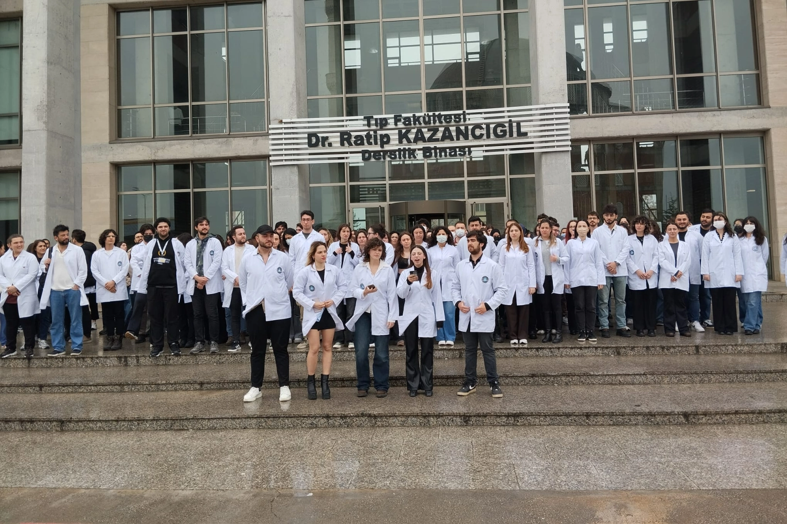 Edirne’de Trakya Üniversitesi Tıp Fakültesi öğrencileri İstanbul Büyükşehir Belediye Başkanı Ekrem İmamoğlu’nun tutuklanması sonrası başlayan gösterilere bugün yaptıkları basın açıklamasıyla katıldılar.
