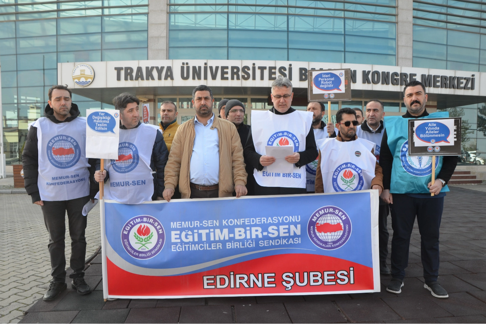 Edirne’de TÜ Balkan Kongre Merkezi önünde Eğitim-Bir-Sen ve Memur-Sen Edirne Temsilcilikleri basın açıklaması gerçekleştirdi. Üniversite idari personelinin yer değişikliği hakkına dikkat çekilen açıklamayı, Eğitim-Bir-Sen Teşkilatlardan Sorumlu Başkan Yardımcısı Atalay Cüce yaptı.