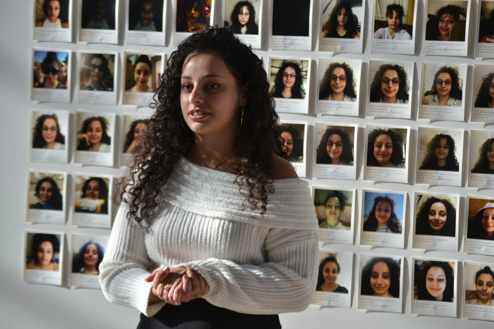 Güler, sergide 4 adet fotoğraflardan oluşan eseri bulunduğunu belirterek; “Birincisi; geçmişimde zorbalığa maruz kaldığım fotoğraflardan oluşuyor. Fotoğraflarımı, yaşım gibi 23 metre kumaşa bastım. Aslında hayat şeridi gibi. Bu fotoğraflar, fotoğraf çektirmeyi sevmememe sebebiyet veren fotoğraflardı. O kadar çok negatif yorum aldım ki fotoğraf çektirmekten nefret ediyordum. Geriye dönüp baktığımda ise o fotoğrafların zorbalığa maruz kalacak bir tarafı olmadığını görüyorum. Bu yüzden sergileme ihtiyacı duydum. Diğer bir eserimde de ‘aynen’ kelimesinin sıkıcılığından bunalıyorum. ‘Aynen’ dememeye çalıştığım bir süreçte, söylediğim her ‘aynen’ kelimesinde kendimi fotoğrafladım ve altına diyalogları yazdım. Bir diğerinde ise Polonya’da bir arkadaşım var. Arkadaşlığımız yıllardır sürüyor. Kendisiyle çok sık görüşemiyoruz ve ‘Kavuşma’ isimli bir iş yaptım. Her gün birbirimize fotoğraflar gönderdik ve arkadaşlığın uzak mesafe de olsa sürebileceğini gösterdik. Aynı zamanda Polonya ile Türkiye arasında bir rota çıkardık” dedi.