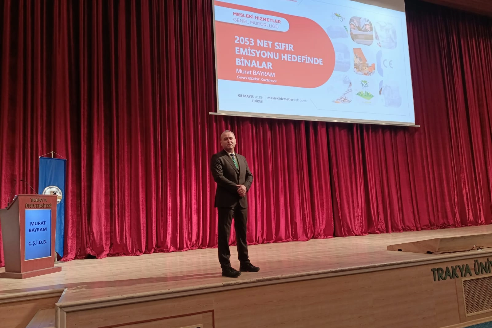 Hatipler’in konuşmasının ardından Çevre, Şehircilik ve İklim Değişikliği Bakanlığı Mesleki Hizmetler Genel Müdür Yardımcısı Murat Bayram, “2023 Net Sınıf Emisyonu Hedefinde Binalar” konusunda sunum yaptı. Bayram, dünyanın daha yaşanabilir olmasının önemine dikkat çekerek; “Hepimiz bir binanın içerisindeyiz. O binayı kullansanız da, kullanmasanız da enerji tüketmeye ve çevreye zarar vermeye devam ediyor. Bina sektöründe ciddi bir potansiyelimiz var. Emisyonların azaltılması, çevreye verilen zararın azaltılması noktasında binaların çok ciddi bir potansiyeli var. Türkiye olarak şöyle bir avantajımız var; bizim binalarımızın büyük bir kısmı ya yenileniyor ya kentsel dönüşümden yıkılıyor ya da bir deprem sonucu yıkılıp tekrar yapılıyor. Dolayısıyla bu yenileme sürecini çok ciddi anlamda yaşadığımız için bunu avantaja çeviriyor olmamız gerekiyor” sözlerine yer verdi.