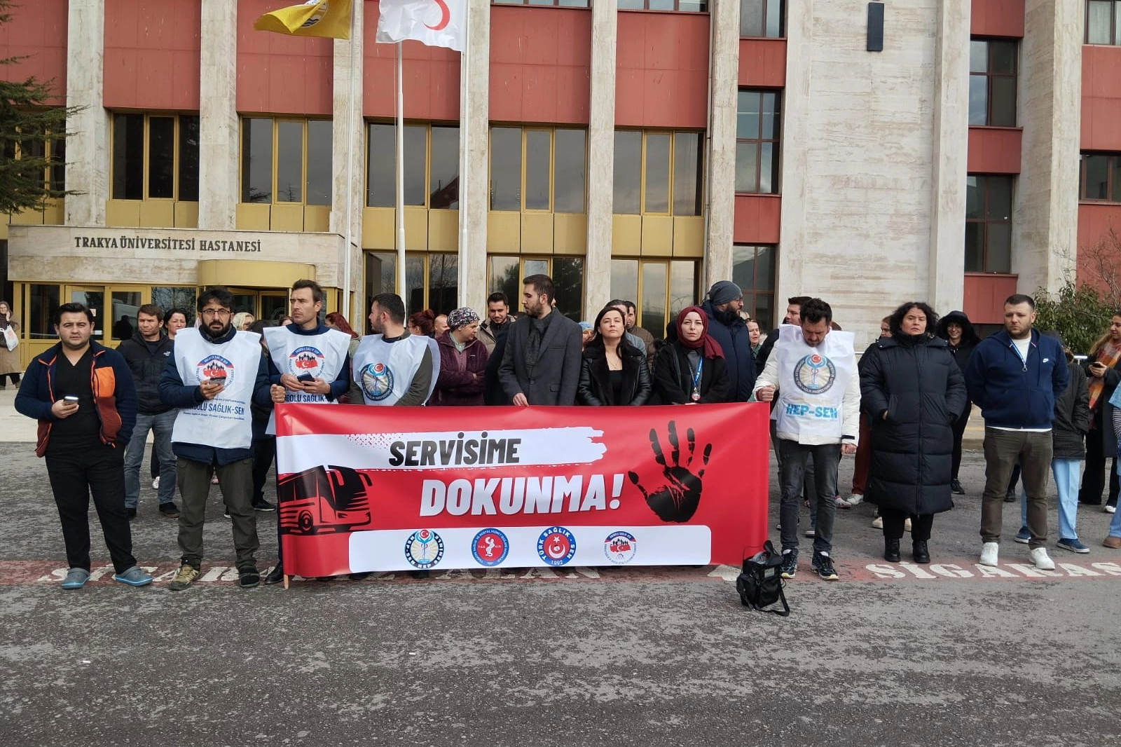 Edirne'de Trakya Üniversitesi Rektörlüğün yeni yıl itibariyle çalışan personel için servis araçlarını kaldırmasına tepkiler sürüyor. Bugün Hep-Sen, Türkiye Sağlık ve Sosyal Hizmet İşçileri Sendikası, Türk Sağlık-Sen, Anadolu Sağlık-Sen üyesi çalışanlar ortak basın açıklaması düzenledi. Basın açıklamasını Türk Sağlık-Sen Edirne Şube Başkan Yardımcısı Muhammed Esen okudu. Açıklamada servislerin çalışanların hakkı olduğunu belirterek, kaldırılmasını eleştirdi.
