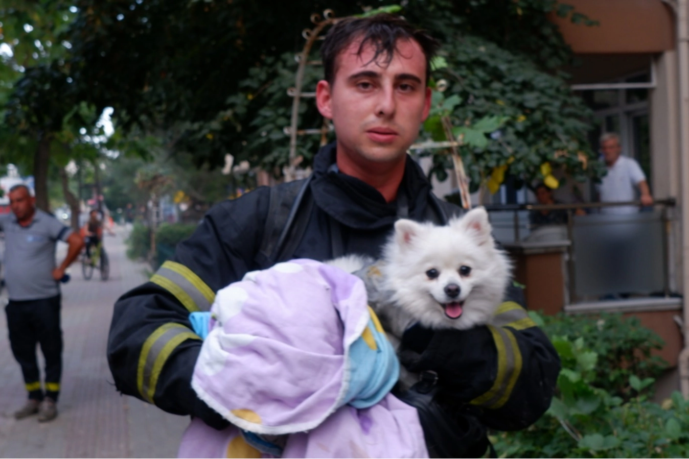 Olay yerine gelen itfaiye ekipleri alevlere müdahale ederken, bir köpeğin evde mahsur kaldığını gördü. Hızlıca köpeği kurtarıp battaniyeye saran ardından da dışarı çıkaran itfaiye eri, daha sonra köpeği bir bahçeye bağladı. Yangın, itfaiye ekiplerinin müdahalesi sonucu söndürüldü.