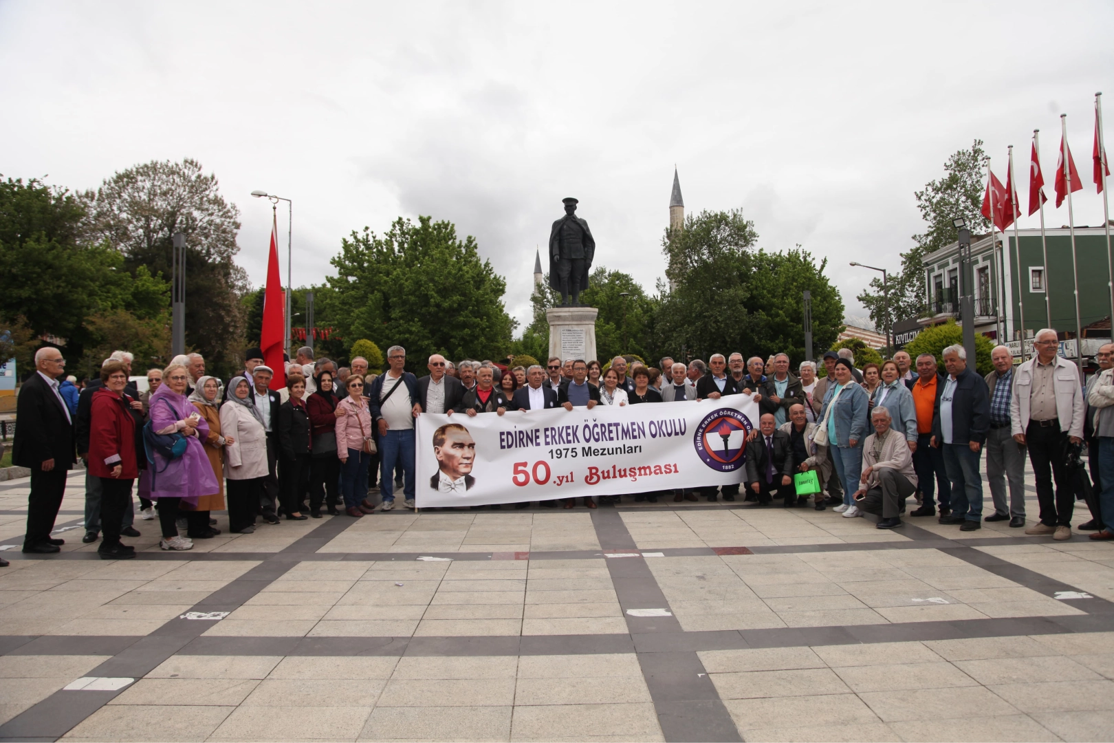 Edirne Erkek Öğretmen Okulu’nun 1975 yılı mezunları, mezuniyetlerinin 50. yılında Edirne’de Atatürk Anıtı'nda bir araya gelerek anlamlı bir buluşma gerçekleştirdi. Aynı zamanda okulun 143. kuruluş yılına denk gelen buluşmada, emekli öğretmenler hem eski günleri yad etti hem de Atatürk’ün aydınlattığı yolda yürümeye devam edeceklerinin mesajını verdi.