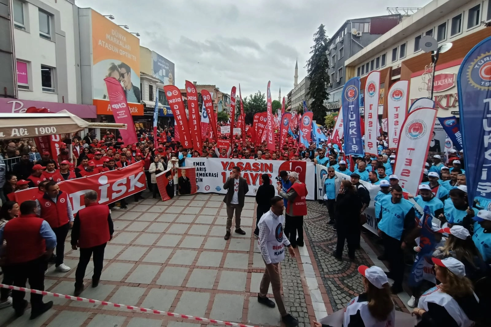 Edirne'de 1 Mayıs Emek ve Dayanışma Günü kutlamaları kapsamında konfederasyonlar, sendikalar, siyasi partiler, odalar ve sivil toplum örgütleri tarafından oluşturulan 1 Mayıs korteji, Saraçlar Caddesi'ne ulaştı.
