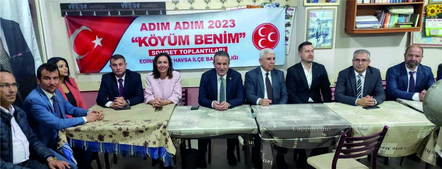 MHP Antalya Milletvekili Abdurrahman Başkan 'Adım adım 2023 Köyüm Benim' Sohbet Programları kapsamında Edirne'ye gelerek, vatandaşlarla bir araya geldi. MHP Genel Merkezi tarafından programlanan 'Adım Adım 2023 Köyüm Benim' toplantıları kapsamında ilçemize bağlı Osmanlı köyünde vatandaşlarla bir araya geldi. MHP Genel Başkanı Devlet Bahçeli'nin talimatlarıyla "Adım Adım 2023; 'Köyüm Benim' Sohbet Toplantıları” temalı köy ziyaretleri kapsamında ilçemize bağlı Osmanlı Köyü'nde yapılan çalışmalara Antalya Milletvekili Abdurrahman Başkan'ın yanı sıra, MYK üyeleri Burhan Coşkun, Murat Turna, ilknur Fidan, Edirne il Başkanı Zakir Tercan , ilçemiz Belediye Başkanı Av. Aydın Balkan,MHP Havsa ilçe Başkanı Erman Erbaş,Ak Parti Havsa ilçe Başkanı Haluk Savaştürk ve partililer katıldı. MHP Antalya Vekili Abdurrahman Başkan “Cumhurbaşkanlığı Hükümet Etme Sistemini” anlatarak, Milletin efendisi köylülerle hasbihâl ettiklerini ifade etti. “Şairin 'Benim Topraklarımın Sınırı Edirne'de Başlayıp Kars'ta Bitmez' mısralarını kendimize rehber edinip, Türkiye'yi karış karış gezmeye devam edeceğiz" diyen Başkan, "Seçim olmadan köylü vatandaşlarımız ile sohbet yapma maksadıyla ve Türkiye'nin meselelerinin ve çözümlerinin ne olması gerektiğini milletimizin efendisi olarak nitelendirilen köylümüz ile paylaşmayı tercih ederek yola çıktık ve bugün burada sizlerin huzurundayız. Sayın Genel Başkanımız Devlet Bahçeli'nin Yunanistan Başbakanına yönelik 'Ülke ülke, ada ada gezip Türkiye'ye silah gösteren, Mavi Vatan haritamızı her gittiği yerde şikayet konusu haline getiren Miçotakis bilmelidir ki, el atına binen çok çabuk inecek, güvendiği dağlara da kar yağacaktır. Bizim tasavvur ve telakkimize göre, vatan vatandır, vatan namustur, denizi, karası olamaz, nihayetinde haremi ismetimize uzanacak muhasım eller ise kırılıp atılacaktır' sözlerini de hatırlatmak isterim” diye konuştu MHP il Başkanı Zakir Tercan,”Edirne Havsa ilçemizde Osmanlı köyümüzde, “Adım Adım 2023; Köyüm Benim” toplantılarımızın 3'üncüsünü gerçekleştirdik. “Cumhurbaşkanlığı Hükümet Etme Sistemini” anlatarak, Milletin efendisi köylülerimizle hasbihâl ettik. Söz konusu çalışmalarımıza katılan Sayın Vekilimize, MYK Üyelerimize çok teşekkür ediyor, saygılarımı sunuyorum. Köyüm benim proğramını organize eden MHP Havsa ilçe Başkanımız Sayın ismail Erman Erbay'a ve Yönetimine çok teşekkür ediyorum.”dedi. Lalapaşa ilçesine bağlı Çömlekakpınar, Süloğlu ilçesine bağlı Büyükgerderli, ilçemize bağlı Osmanlı ve Edirne merkez ilçeye bağlı Avarız köyü olmak üzere 4 köyde sohbet toplantıları gerçekleştiren MHP heyeti, ardından basın mensupları ile bir araya geldi. MHP Genel Merkezi tarafından programlanan 'Adım Adım 2023 Köyüm Benim' toplantıları kapsamında Edirne'ye gelen MHP Antalya Milletvekili, MYK Üyesi ve Genel Başkan Başdanışmanı Abdurrahman Başkan, MHP il Başkanlığı'nda toplantı düzenledi. Toplantıya MHP MYK üyeleri Burhan Coşkun, Murat Turna ve ilknur Fidan ile il Başkanı Zakir Tercan da katıldı.