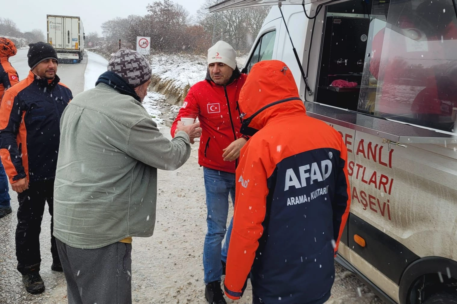 AFAD ve Kızılay ekipleri soğuk havanın etkili olduğu kentte sırada bekleyen TIR sürücülerine destek oldu.