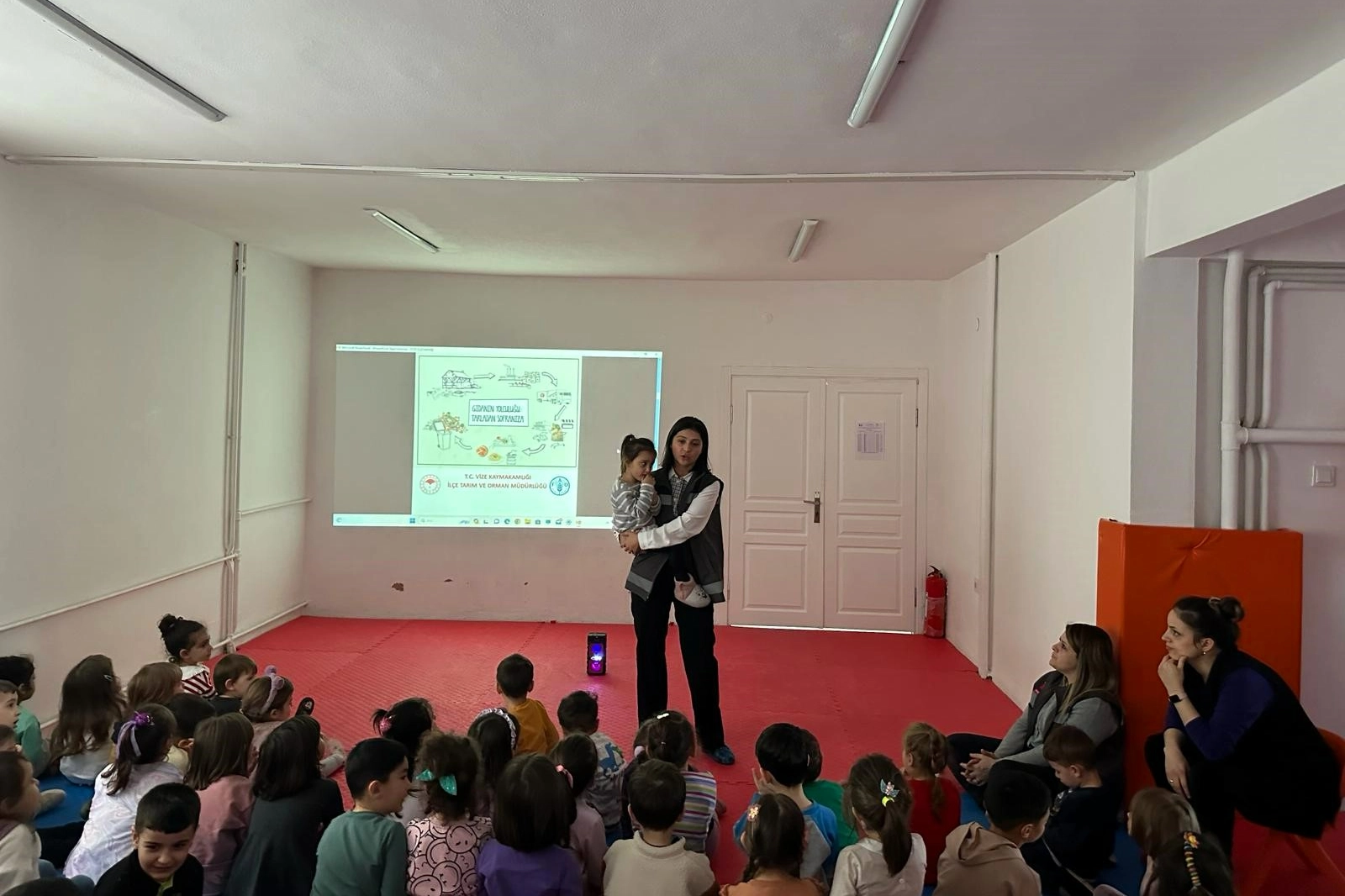 Kırklareli’nin Vize ilçesinde bulunan anaokulu öğrencilerine, İlçe Tarım ve Orman Müdürlüğü teknik personelleri tarafından, ‘Su Verimliliği Seferberliği ve Gıdanı Koru Seferberliği’ kapsamında Bakanlık tarafından hazırlatmış olan çocuklara yönelik eğitici video ve sunum içerikleriyle birlikte eğitim sunumları yapıldı.