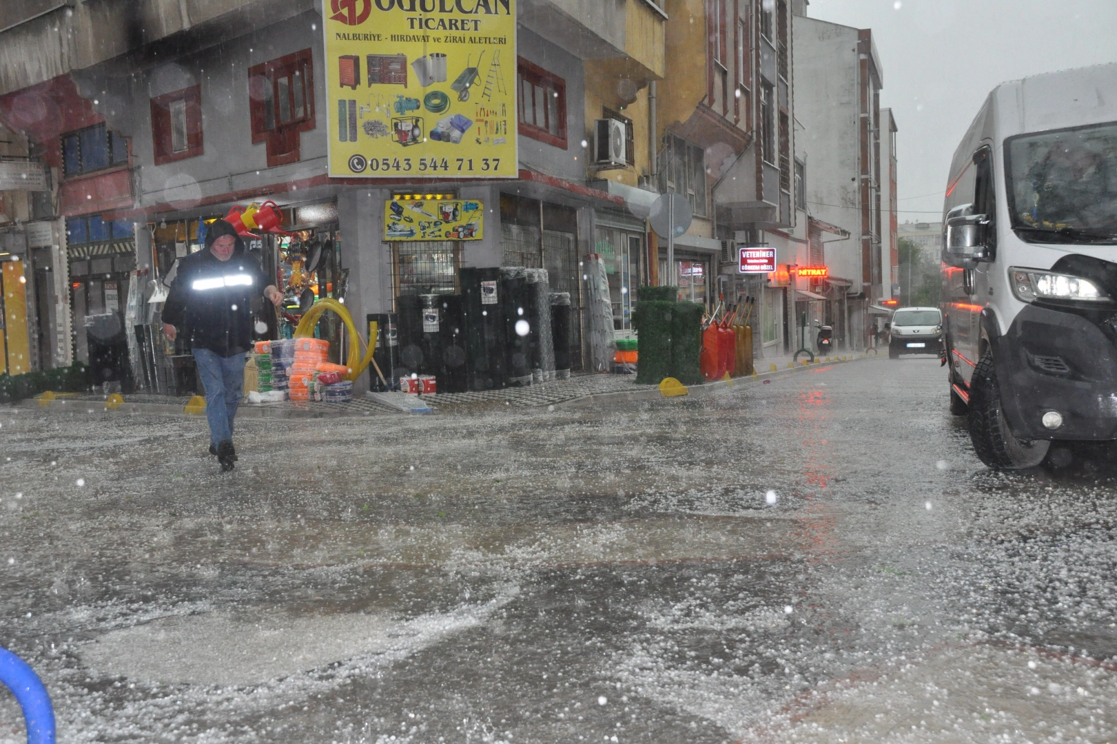 Keşan’da beklenmedik bir şekilde etkili olan dolu yağışı, şehirde hayatı olumsuz etkiledi. Ani yağış ile birlikte cadde ve sokaklar beyaz bürünürken, dolu yağışından korunmaya çalışan vatandaşlar, en yakındaki işyerlerine girmeye çalıştı. Bazı vatandaşlar, kafalarına koli geçirerek yoluna devam etmek istedi. Dolu yağışının ardından kentte sağanak yağmur başladı.