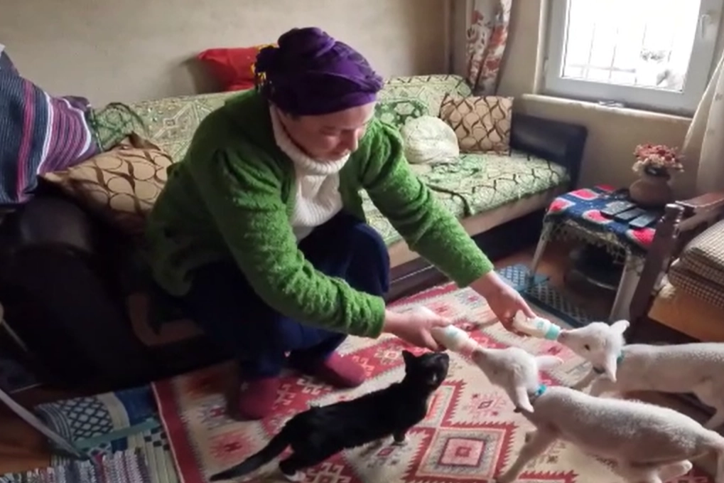 Aynur Öztürk, 1 ay önce ağıldaki kuzulardan ikisinin bakımsız olduğunu fark etti. Annesinin kabullenmediği kuzuları evine alan Öztürk, evindeki sobanın yanında baktığı yavruları biberonla doyuruyor.