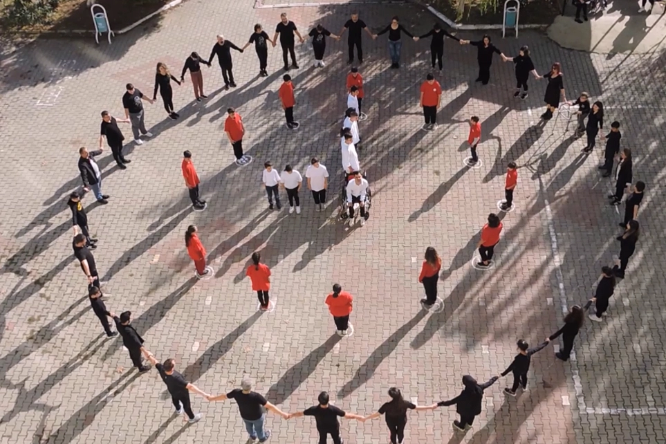 Okul bahçesinde öğrenciler saatler 09.05'i gösteren koreografisi oluşturdu.