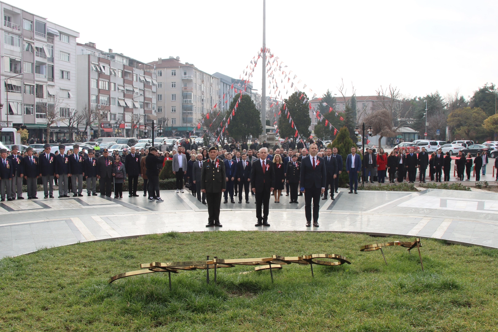 Özgürlük ve Demokrasi Meydanı'nda gerçekleştirilen törende, Vali Uğur Turan, 55. Mekanize Piyade Tugay Komutanı Tuğgeneral Erdal Köse ile Belediye Başkanı Derya Bulut Atatürk Anıtı'na çelenk sundu.