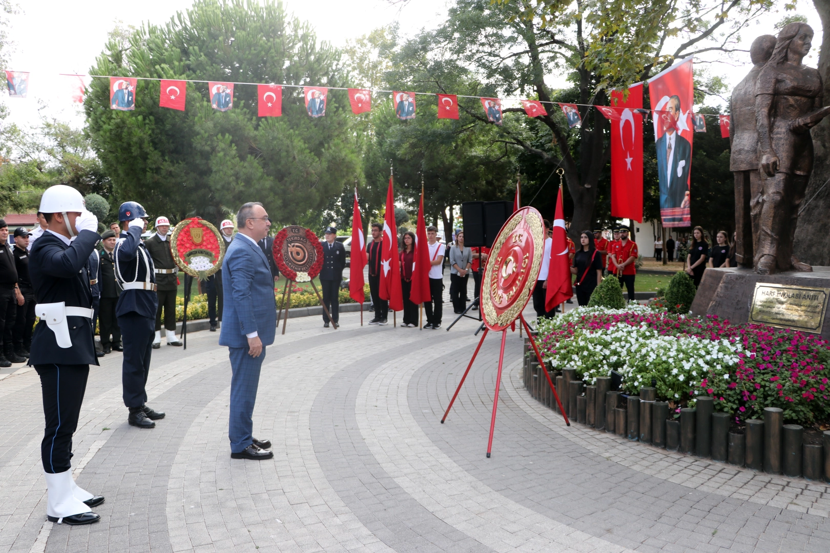 Sahil dolgu alanındaki törende, Tekirdağ Valisi Recep Soytürk, Garnizon Komutan Vekili Piyade Albay Zeki Yavuz ve Tekirdağ Büyükşehir Belediye Başkanı Candan Yüceer, Atatürk Anıtı'na çelenk sundu. Ardından saygı duruşunda bulunuldu, İstiklal Marşı okundu.