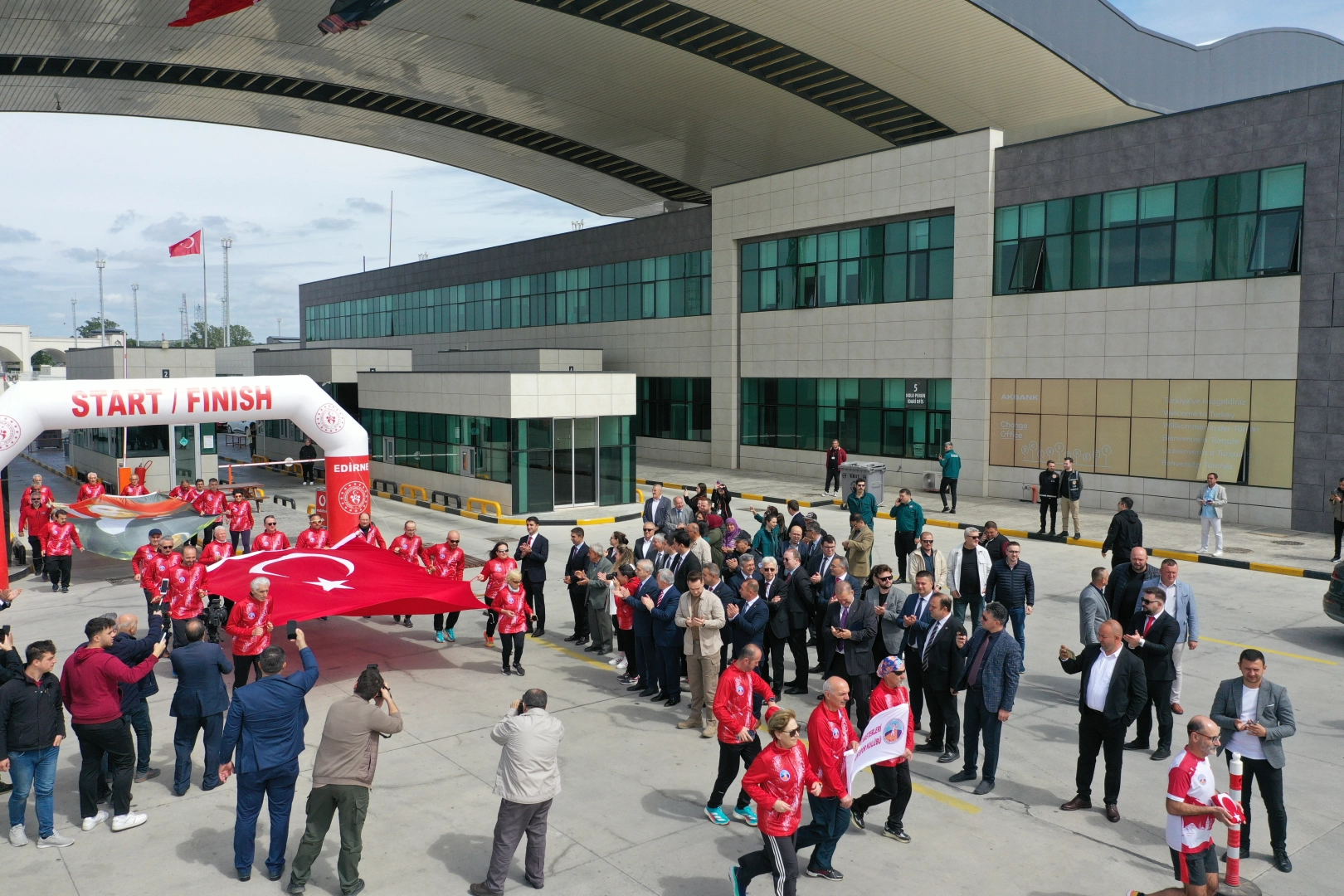 Sınır kapısında düzenlenen törende, Türk bayrağına sarılı toprak Atatürk'ü Anma ve Barış Koşusu'na katılan İstanbul Masterleri Atletizm Spor Kulübü sporcularına teslim edildi.