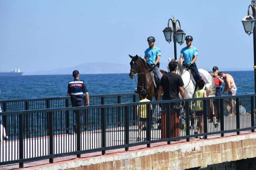Devriye gezen atlı tim, sahilde bulunan vatandaşlardan ilgi gördü.