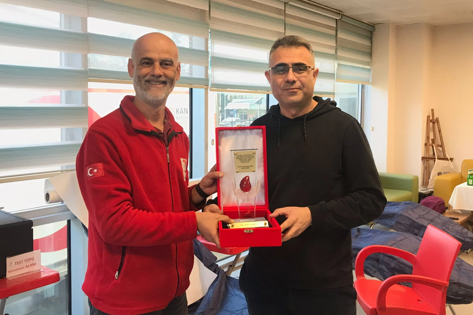 Aksoy, Ozan Aydoğdu nezdinde tüm vatandaşları kan bağışına davet ettiğini belirterek “Ozan Aydoğdu bizim sürekli çok duyarlı bağışçılarımızdan. Biz Kızılay olarak 10. bağışını yapmış vatandaşlara bronz madalya, 25. bağışını yapmış olan bağışçılarımıza gümüş madalya, 35. Bağışını yapmış olan bağışçılarımıza altın madalya, 45 ve üzerindeki kan bağışı yapmış bağışçılarımıza ise plaket hediye ediyoruz. Biz genelde bağışçılarımızla tanış olmaya başlarız. Ozan Beyle de sürekli görüştüğümüz için burada çalıştığını biliyorduk. Burası ona özel değildi ama biz organizasyonumuz içerisinde onunda burada çalıştığını bilerek bir jest yapmak istedik. Böyle bir organizasyon içerisine girdik ve kendisine plaketini bugün burada 57. bağışını yaptığı için de takdim ettik. Umarım Ozan Bey nezdinde tüm vatandaşlarımızı da kan bağışına davet etmiş oluruz” diye konuştu.