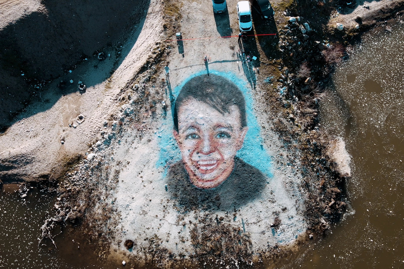 Azerbaycanlı ressam Abdullayev de desteğin artması amacıyla Meriç Nehri kenarına toprak zemin üzerine kas hastası çocuğun dev portresini akrilik su bazlı boya ile resmetti.