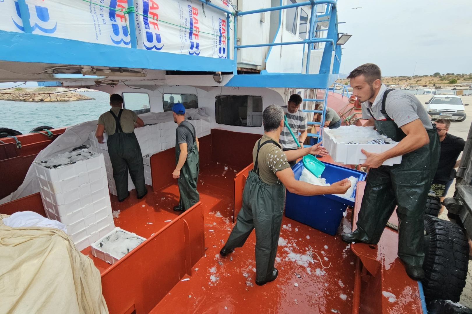 Türk karasuları başta olmak üzere uluslararası sularda ağ atan trol ve gırgır tekneleri tüm mürettebatıyla yoğun bir mesai harcıyor. Saros Körfezi açıklarında Ege denizine doğru açılan balıkçılar ağırlıklı olarak sıralar hamsi ve sardalya ile ağlarını dolduruyor. Yıllardır balıkçılık yapan Ferhat Kaya, gece yarısı saat 12 gibi çıktıklarını gündüz ise saat 13 gibi limana geldiklerini ifade ederek, "Uluslararası sularda çalışıyoruz. Allah bereket versin bir şeyler oldu. 390 kasa balıkla beraber döndük. Genelde biz hamsiye bakıyoruz. Fiyatlar şimdilik ucuz. Kasası bin 500 TL civarında. Aracılar olunca tezgahta şu an kilosu 500 TL. Bütün emeği veren biziz" dedi.