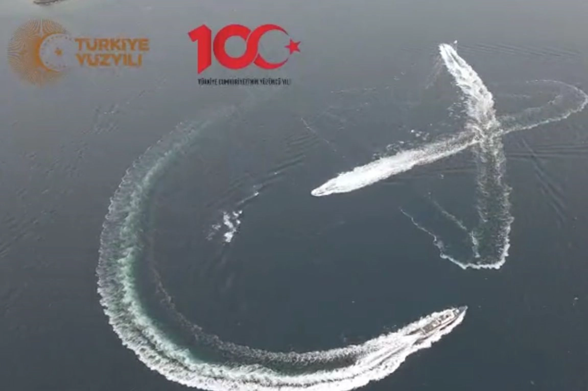 Karadeniz kıyısında bulunan Kırklareli'nin Demirköy ilçesine bağlı İğneada beldesinde balıkçılar, Cumhuriyet'in 100. yılı etkinlikleri kapsamında tekneleriyle koreografi hazırladı.