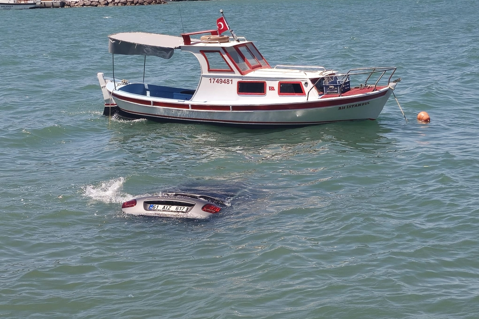 Sürücü, çevredeki balıkçıların müdahalesiyle tekneye alındı.