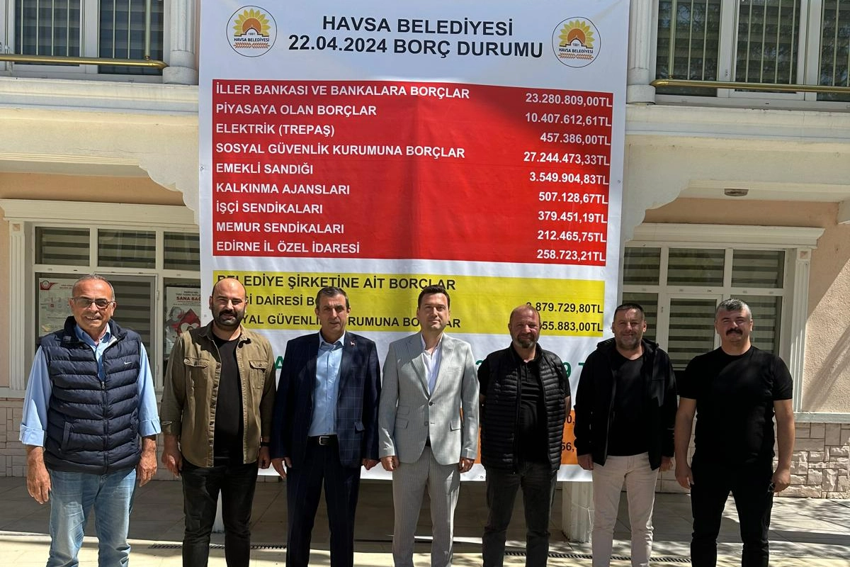 Havsa geçmiş dönem Belediye Başkanı Aydın Balkan, Havsa Belediye binasına asılan geçmiş dönem borç listesi için açıklamada bulundu. 31 Mart 2019 itibarı ile şirket borçları hariç 40 Milyon lira civarı borç ve 11 Milyon Lira toplam bütçe ile devraldığını söyleyen Balkan, Havsa Belediye Başkanı Hüseyin Özden’in o dönem CHP Belediye Meclis grubunun da başında, CHP İlçe Başkanlığı’nda ve hesapların bizzat içerisinde olduğunu söyledi.