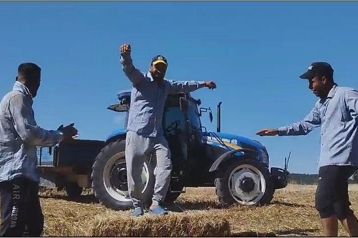 Yevmiyeli işe giden hamalların sıcak havada zorlu balya mesaisi eğlenceye dönüştü. Sıcaktan bunalan hamallara müzik yayını yapan tarla sahibinin telefonuyla kaydettiği görüntüler, sosyal medyada büyük beğeni topladı. Sıcak havaya aldırış etmeyen hamallar, saman balyalarını traktör römorkuna yüklerken, oynayarak eğlenceli vakit geçirdi.