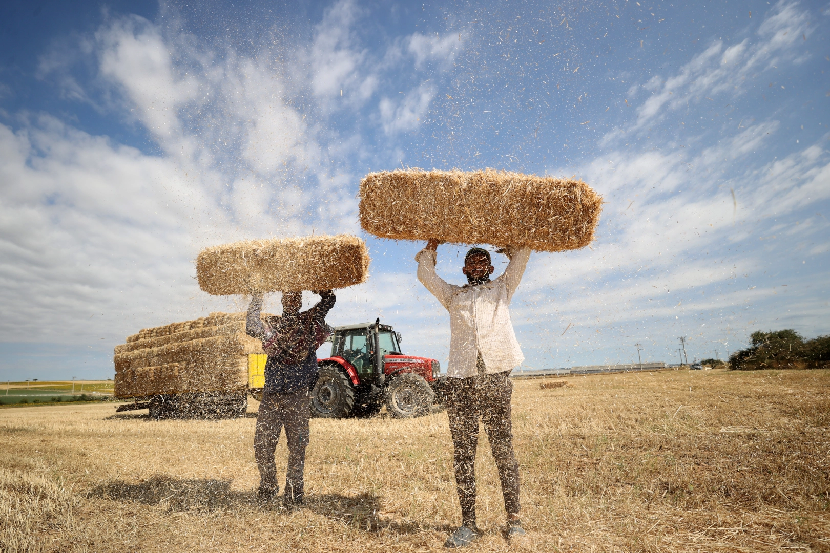 Öğle saatlerinde sıcaklığın ve römorktaki balyaların sayısının artmasıyla işçiler için zorluk da katlanıyor. Balyaları 2-3 metre yükseğe atmak zorunda kalan işçiler tüm zorluklara rağmen mesailerini sürdürüyor.