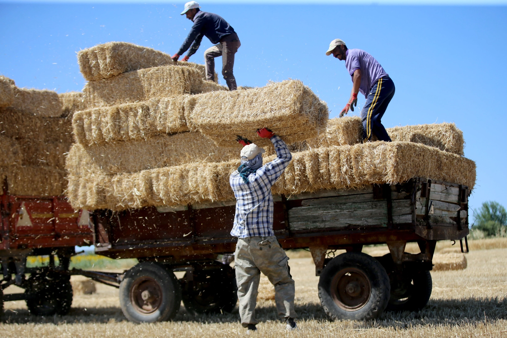 Tarım arazilerinde yavaş yavaş ilerleyen traktör römorkunun peşinden giden işçiler, saman balyalarını beden gücüyle römork üzerine atıyor. Römork üzerinde bulunan diğer işçiler de atılan balyaları istifliyor.