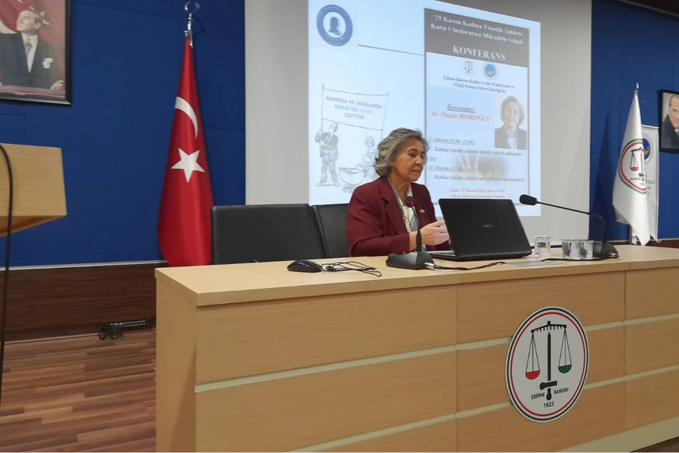 Edirne Barosu Kadın ve Aile Komisyonu ve Türk Üniversiteli Kadınlar Derneği Edirne Şubesi İşbirliğinde "25 Kasım Kadına Yönelik Şiddete Karşı Uluslararası Mücadele Günü" kapsamında düzenlenen konferansın konuğu, İstanbul Kadın Kuruluşları Birliği (İKKB) Koordinatörü Av. Nazan Moroğlu oldu. Edirne'de ki sivil toplum kuruluşları temsilcileri ve üyelerinin de katıldığı konferansın birinci bölümünde Moroğlu, şiddetle hukuk yolu ile mücadelede, uluslararası sözleşmelerden özellikle (CEDAW) Kadına Karşı Her Türlü Ayrımcılığın Önlenmesi ve İstanbul sözleşmelerinden söz etti.