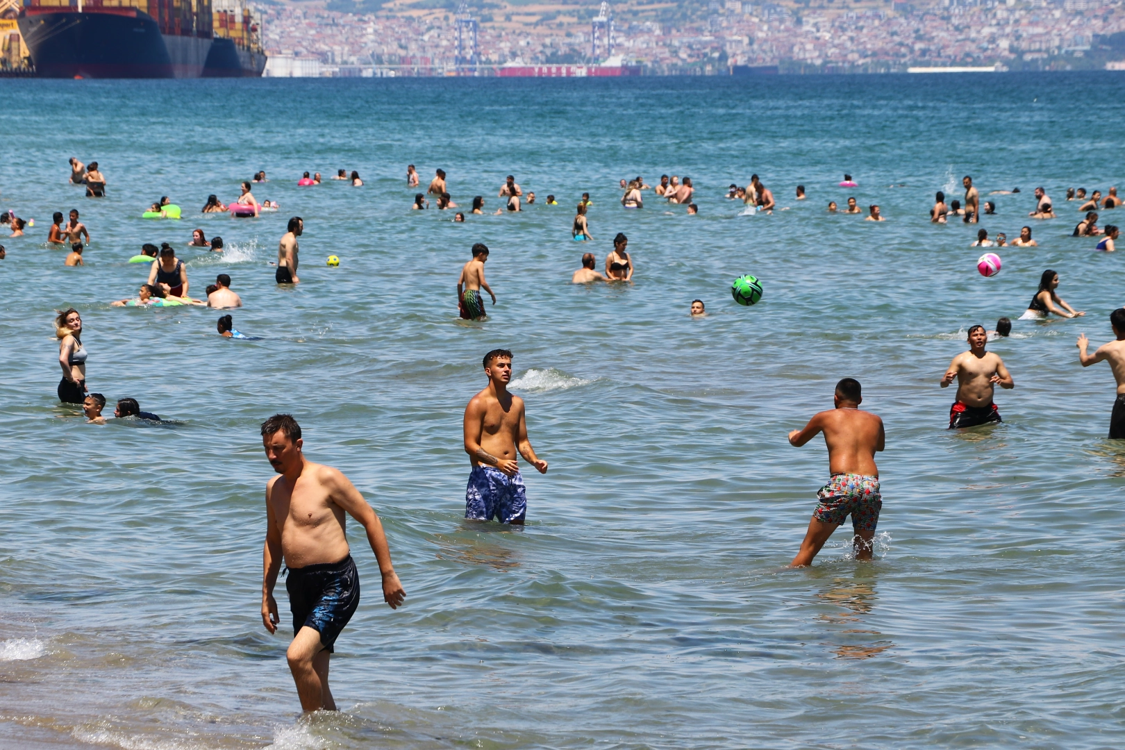 Denize girerek Marmara'nın serin sularının tadını çıkaran ailelerden bazıları da sahilde çocuklarıyla oyun oynadı.