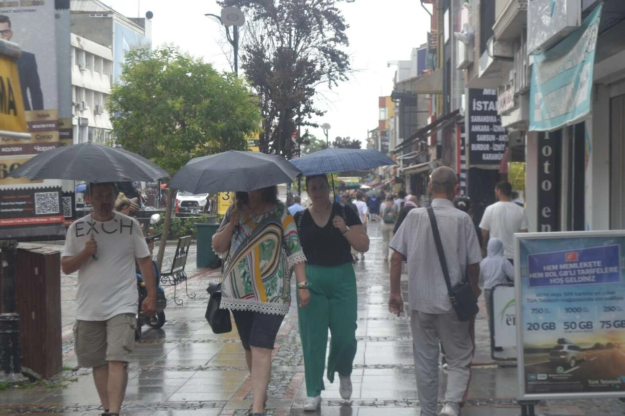 Vatandaşlar, yağışa hazırlıksız yakalanarak minibüs duraklarına veya iş yerlerinin önündeki tentelerin altına sığındı. Bu durum da ilçe merkezinde trafikte aksamalara yol açtı.