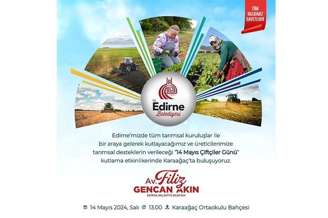 Edirne’de tüm tarım kuruluşlarının katılacağı 14 Mayıs Dünya Çiftçiler Günü kutlama etkinlikleri 14 Mayıs Salı Günü Saat: 13.00’da Karaağaç Mahallesi Ortaokulu Bahçesinde düzenlenecek. Edirne Belediye Başkanı Av. Filiz Gencan Akın, tarım kuruluşları, çiftçiler ve vatandaşlar ile bir araya gelecek, çiftçilere mazot, gübre, yem, ilaç ve fide desteğinde bulunacak.