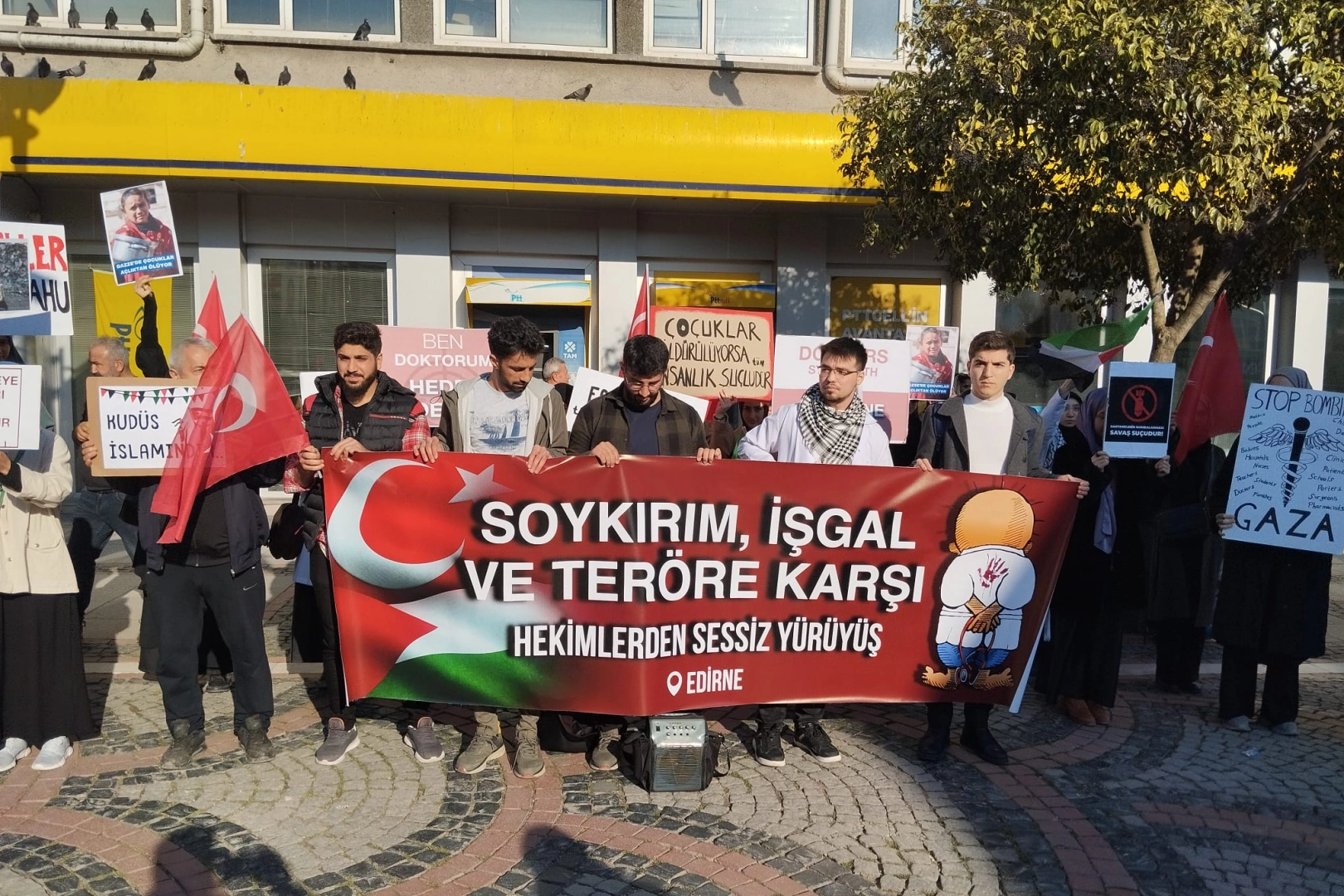 Trakya Üniversitesi Tıp Fakültesi öğrencileri ve sağlık çalışanları İsrail’in Gazze işgalinden sonra her Cumartesi günü Edirne’deki Eski Cami’den Saraçlar Caddesi’ne sessiz yürüyüş gerçekleştiriyor. Bugün gerçekleşen yürüyüş sonrası Saraçlar Caddesi’nde postane önünde yapılan basın açıklamasında İsrail mallarına boykot çağrısı yinelendi.